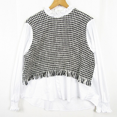 【中古】ザラ ZARA ブラウス 長袖 異素材切替 ツイード ストレッチ コットン レーヨン L ブラック ホワイト
