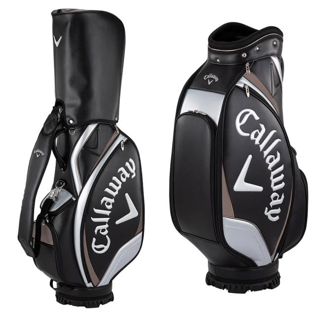 ブランドロゴを大きくデザインしたプレミアムなアメリカンテイストゴルフバッグ。生地は合成皮革と2種類のエナメル素材をミックス。