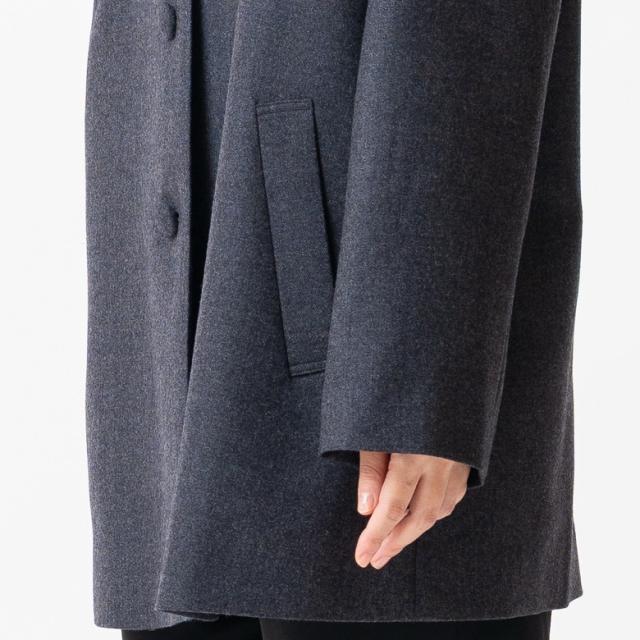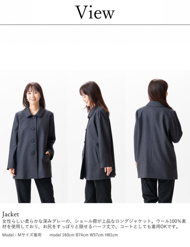 軽くてあたたかみのあるウール100%素材を使用したラウンド衿のロング丈ジャケット。ブラックよりも柔らかい印象で、ほどよく引き締め効果もある上品な深みのあるグレー色です。気になる部分を隠せるゆったりジャケットで、コートとしても着まわせる便利な1着です。