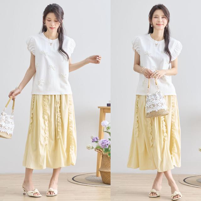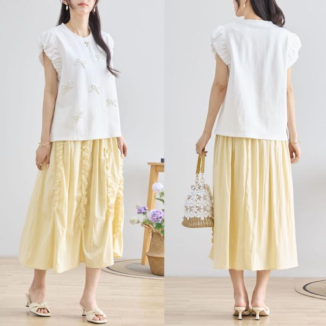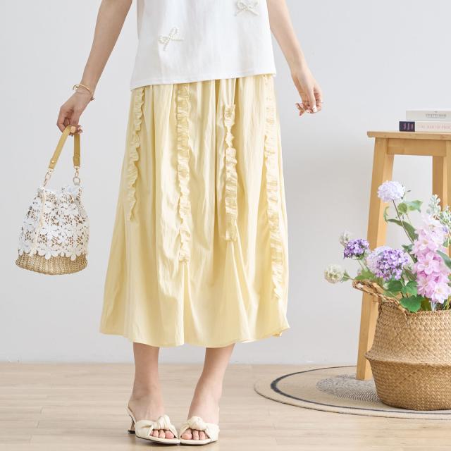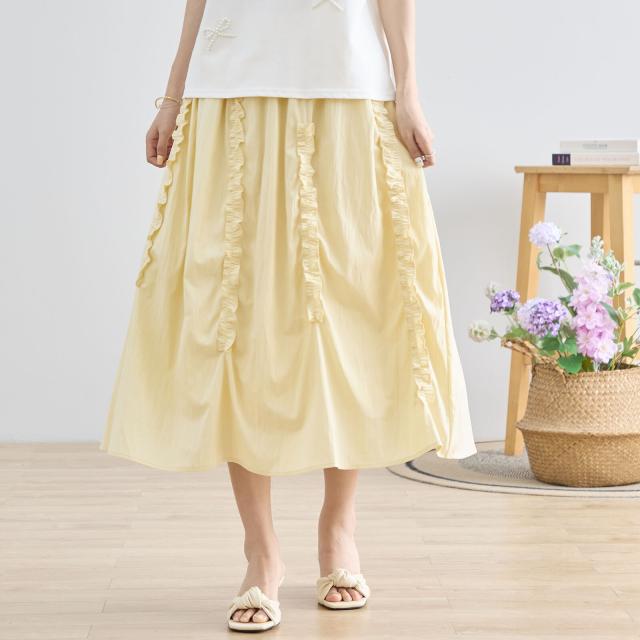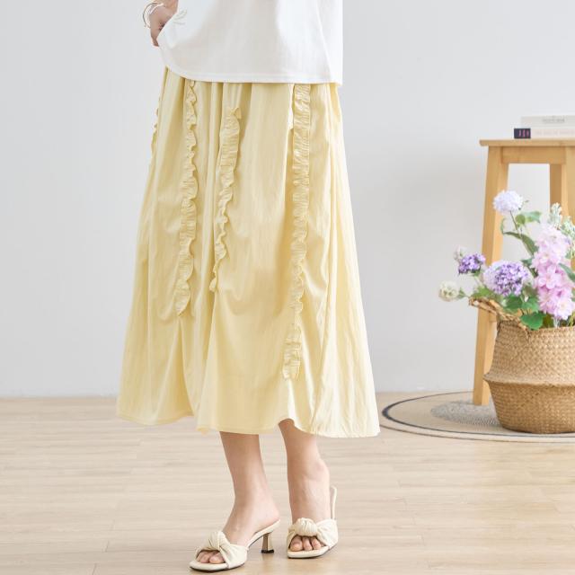 【即納】フリルラインギャザースカート フレアスカート ウエストゴム 膝下丈 ボトムス 春夏 春新作