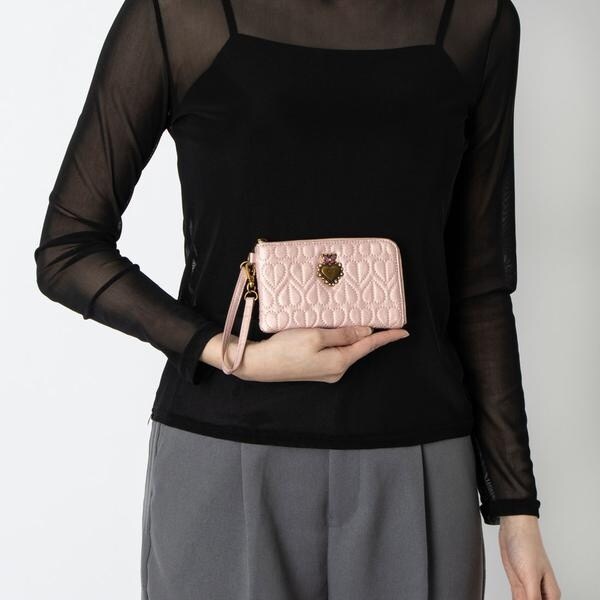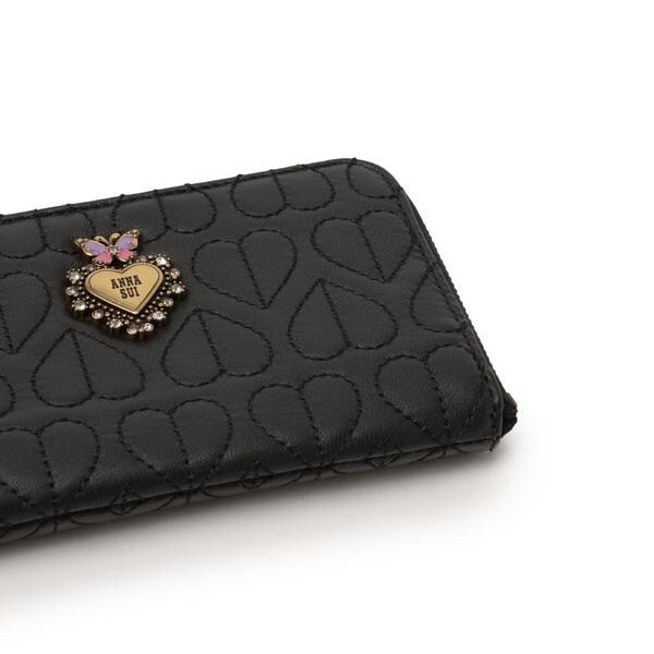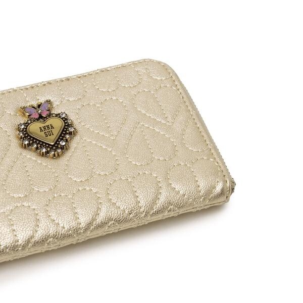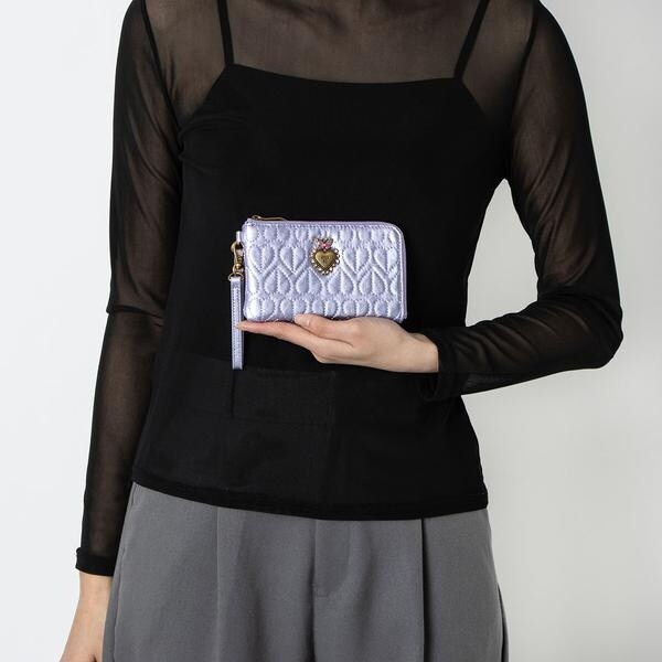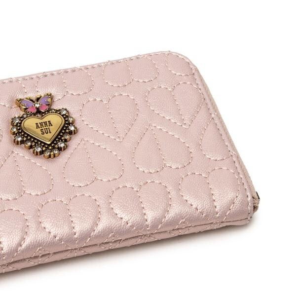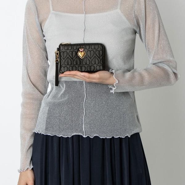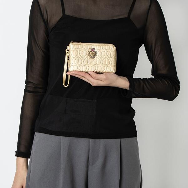 ハートのキルティングと繊細なブローチが印象的な、フェミニンでどこかクラシックなムードを纏った「ドリーミー」シリーズ。甘くなりすぎないハートモチーフに、バタフライを組み合わせたANNA SUIらしい世界観が、大人の可愛らしさと上品さを演出します。軽やかで柔らかなレザーを使用し、手に馴染む心地よい質感に仕上げ、日常使いでもストレスのない使い心地を実現。箔加工を施した革は、光沢を抑えた上品な表情と繊細なカラーリングが魅力で、長く使うほどに味わいが増します。薄マチの長財布や、収納力のあるかぶせ長財布、定番の口金二つ折り財布、マルチケースやパスケースまでラインナップが充実しており、ライフスタイルや用途に合わせて選べるのもポイント。デイリー使いはもちろん、ギフトや記念日の贈り物にも最適な、ANNA SUIならではの華やかさと実用性を兼ね備えたシリーズです。【メーカーサイズ寸法(実寸)】サイズ:H:9/W:14/D:1/ストラップ:12/重さ:90g/カードポケット:5/フリーポケット:1