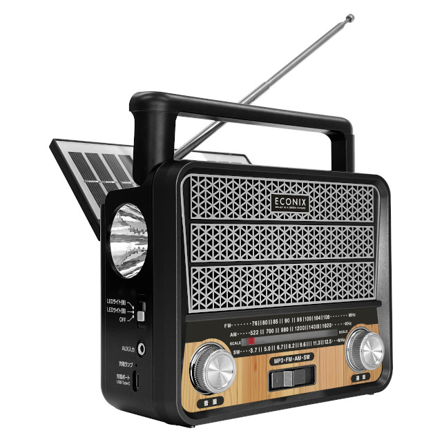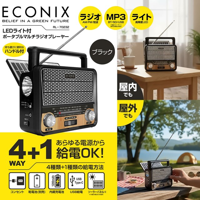 ECONIX LEDライト付ポータブルマルチラジオプレーヤー RL-70232【トレードワン ラジオ ワイヤレススピーカー MP3 ライト ソーラーパネル コンセント 乾電池 内蔵充電池 USB給電 Bluetooth マイクロSD キャンプ アウトドア 防災 災害 母の日 父の日 クリスマス xmas】