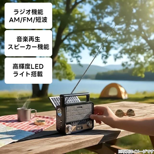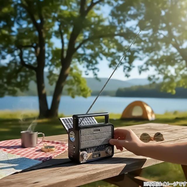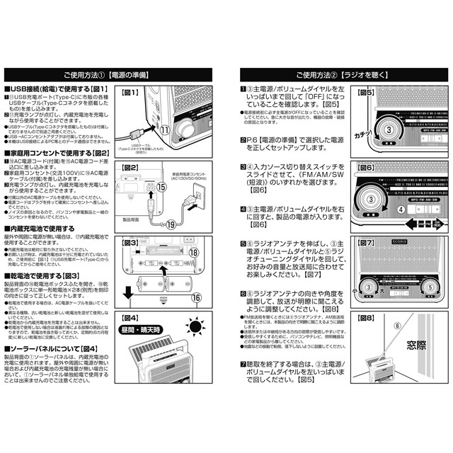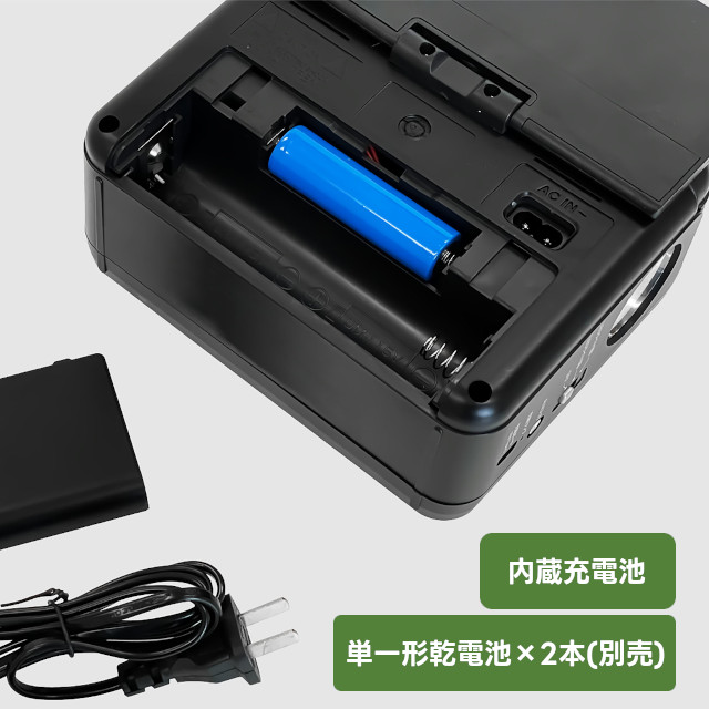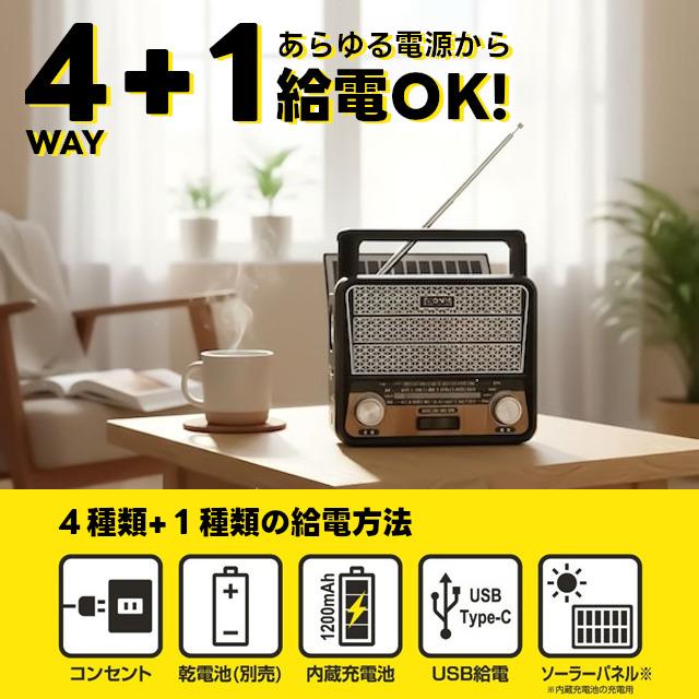電源もコンセント・単一形乾電池×2本・USBケーブル・ソーラー充電(充電のみ)と幅広い給電・充電方法でどんな場所でも使えます。