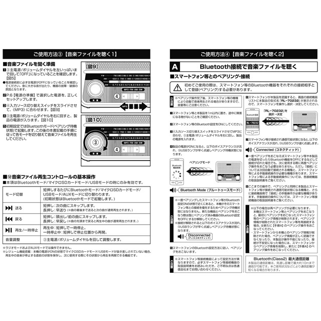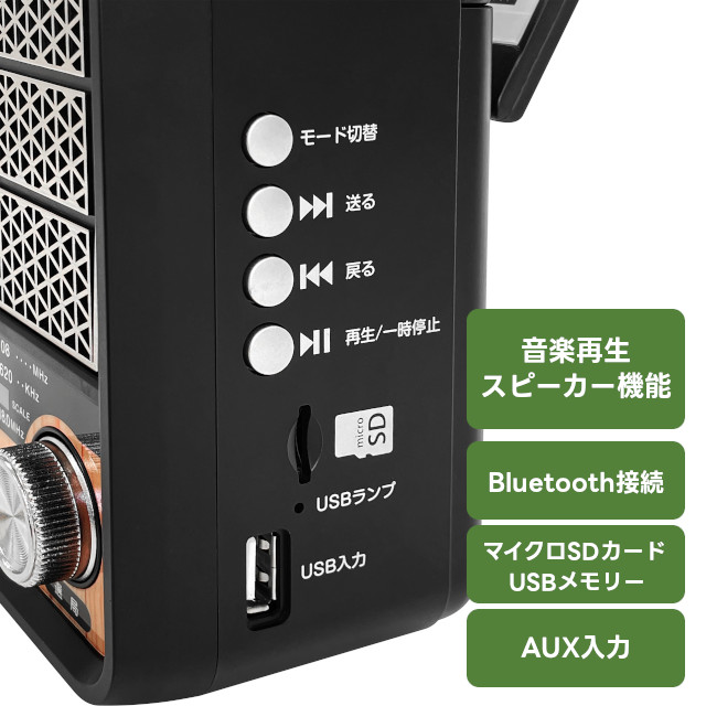 音楽再生&スピーカー Bluetooth接続・USBメモリ&SDカードに入れたの音楽データの再生・AUX接続。