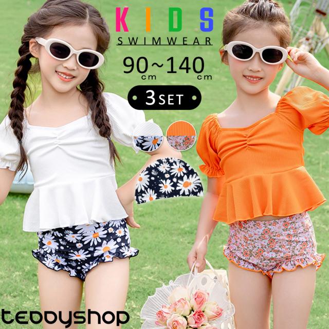 キッズ 水着 セパレート 女の子 子供 半袖 パフスリーブ リブ ペプラム ショーツ スイムキャップ 3点セット バック カットアウト パッド付 パッド追加 一部サイズのみ 裏地付き 幼稚園 保育園 小学生 低学年 高学年 90 100 110 120 130 140 白