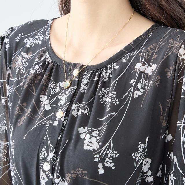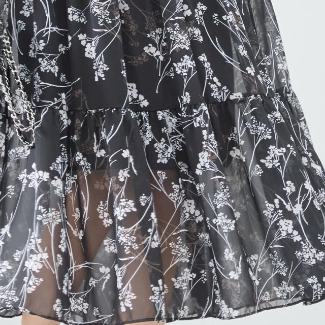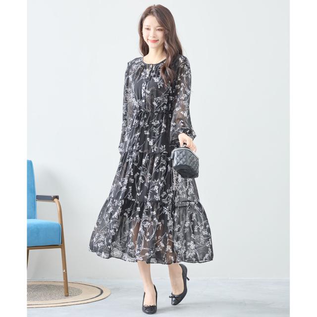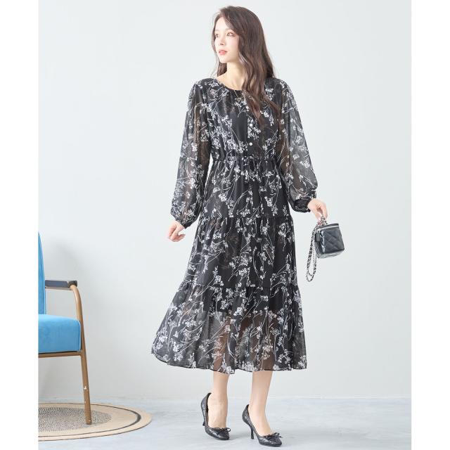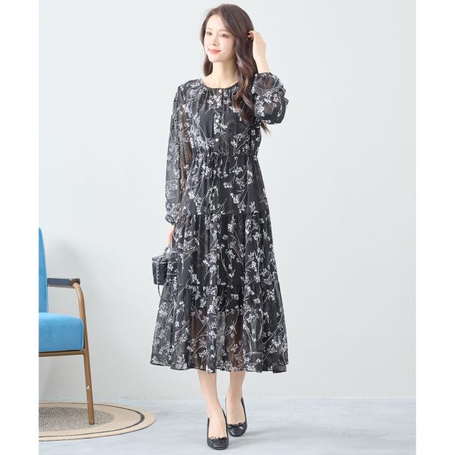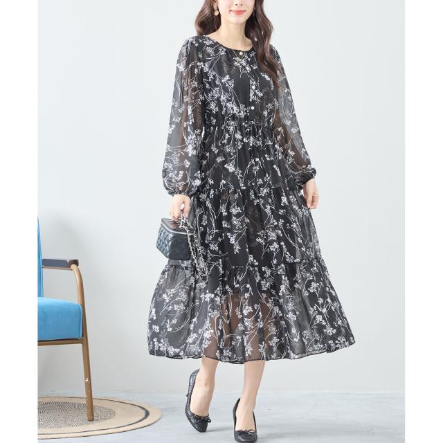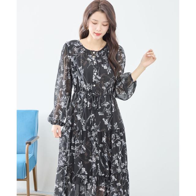 【即納】シフォン花柄フレアロングワンピース モノトーン 長袖 膝下丈 春夏 春新作