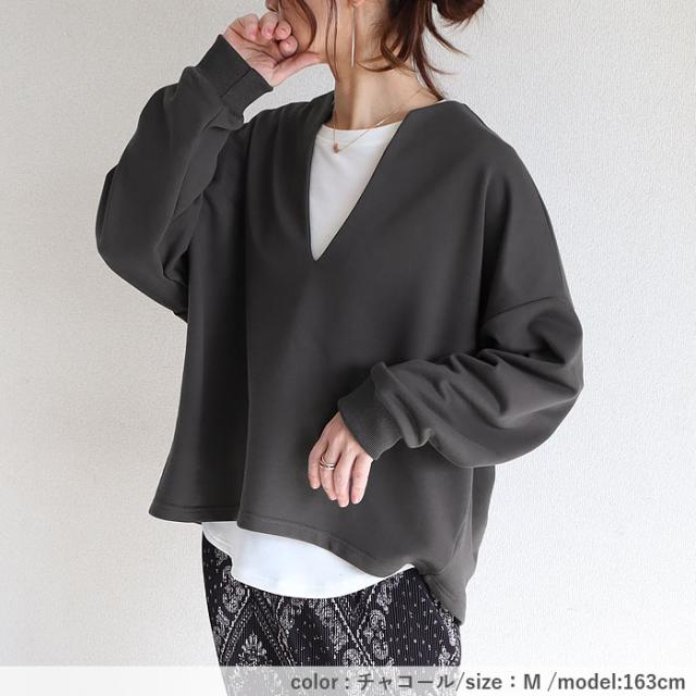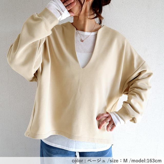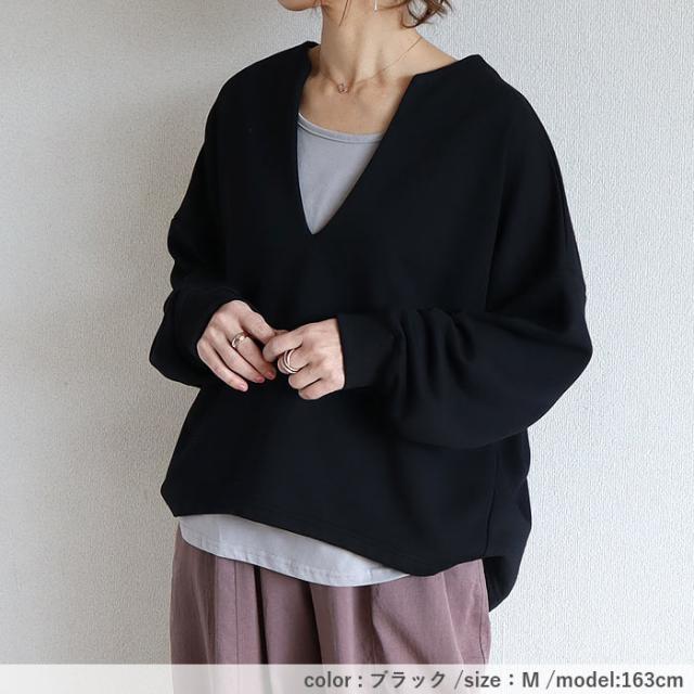 春新作 レディース トップス スウェット プルオーバー 長袖 Vネック レイヤード 重ね着 コットン混 綿混 無地 黒 春 秋 おしゃれ [郵3]^t1131-1^