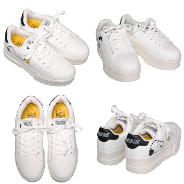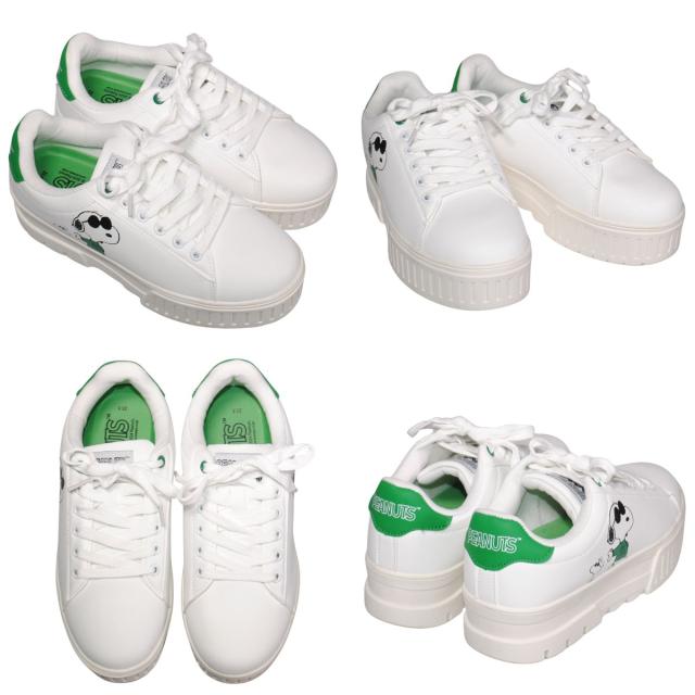 PEANUTS PN8277 22.5cm〜25cm レディース スヌーピー スニーカー ホワイト/グリーン カジュアル レースアップ コートスタイル ボリュームソール 合皮 厚底