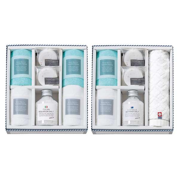 内容/マイクロファイバークロス(中国)(25×25cm)×6、ソルトフィズ(40g)×4、イタリアンバスソルト(イタリア)(180g)・オーストラリアバスソルト(オーストラリア)(175g)・今治ウォッシュタオル(28×30cm)×各1