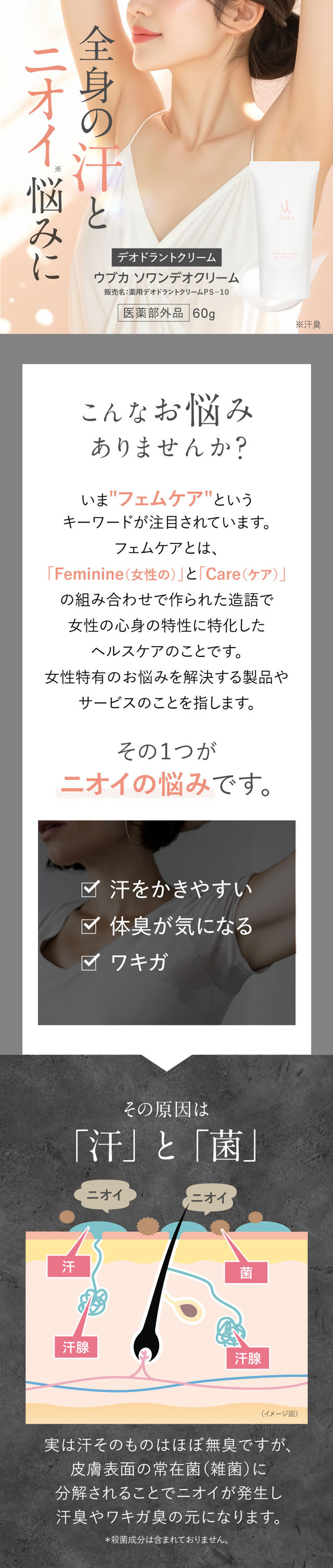 ニオイ(※)の原因である「汗」と「菌」に着目し、全身の汗を抑え、汗臭、わきがのニオイを防ぐ薬用デオドラントクリームです