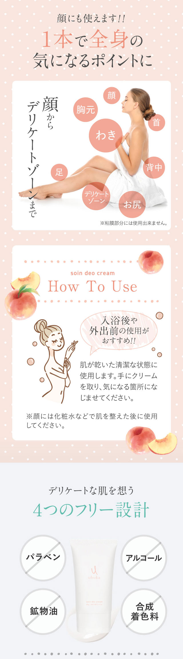 | 特徴 | 発汗抑制・収れん作用のある有効成分「パラフェノールスルホン酸亜鉛」を配合。 ニオイ(※1)の原因である「汗」と「菌」に着目し、全身の汗を抑え、汗臭、わきがのニオイを防ぐ薬用デオドラントクリームです。 使うたび気分の上がるピュアな白桃と爽やかなメントールの香り。 みずみずしく潤いながらもベタつかず肌なじみの良いクリームのため、お顔からデリケートゾーン(※2)まで全身の気になる箇所にご使用いただけます。 ※1 汗臭 ※2 粘膜には使用できません 【フリー処方】 パラベン、アルコール、鉱物油、合成着色料 【配送について】 品名には「化粧品(アルコール濃度24%未満)・雑貨・サプリメント等」と表記してお届けいたします。 |