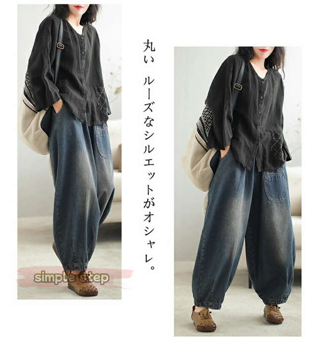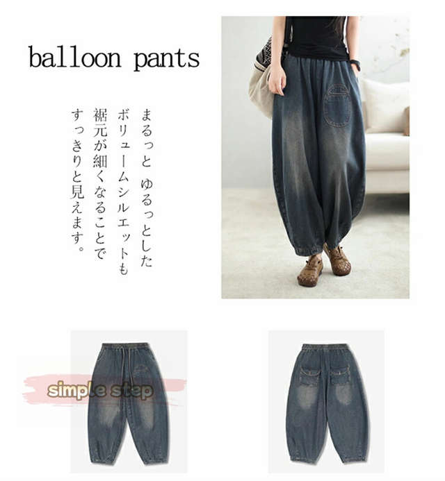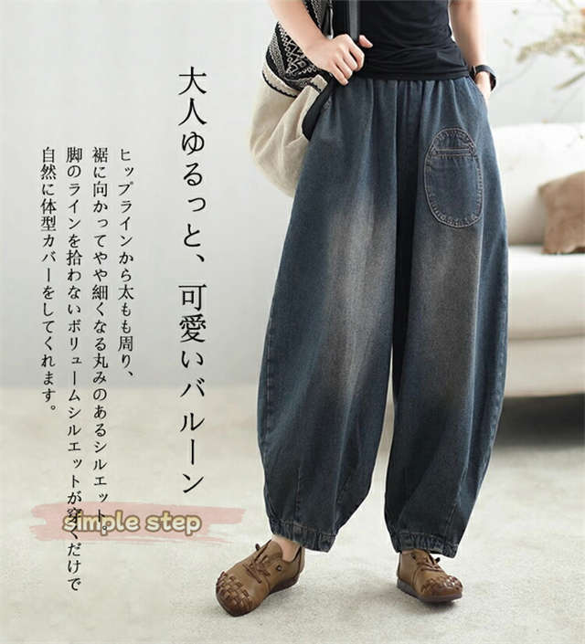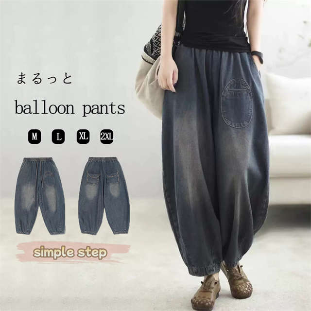 サーカスパンツ 低身長 デニム バルーンパンツ レディース 50代 40代 デニムパンツ 大きいサイズ かわいい 女の子 サルエルパンツ ジーンズ イージーパンツ ゴム ロングパンツ バルーン 丸み コクーンパンツ 色落ち