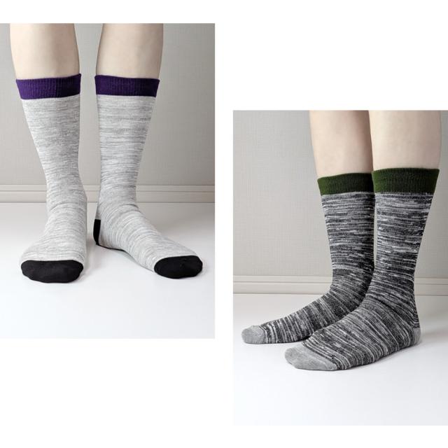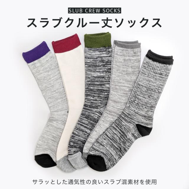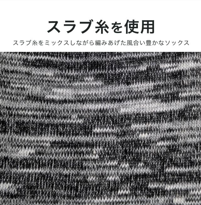 〇スラブ糸を使用した、ナチュラルな風合いと高い通気性が魅力のメンズクルー丈ソックス。