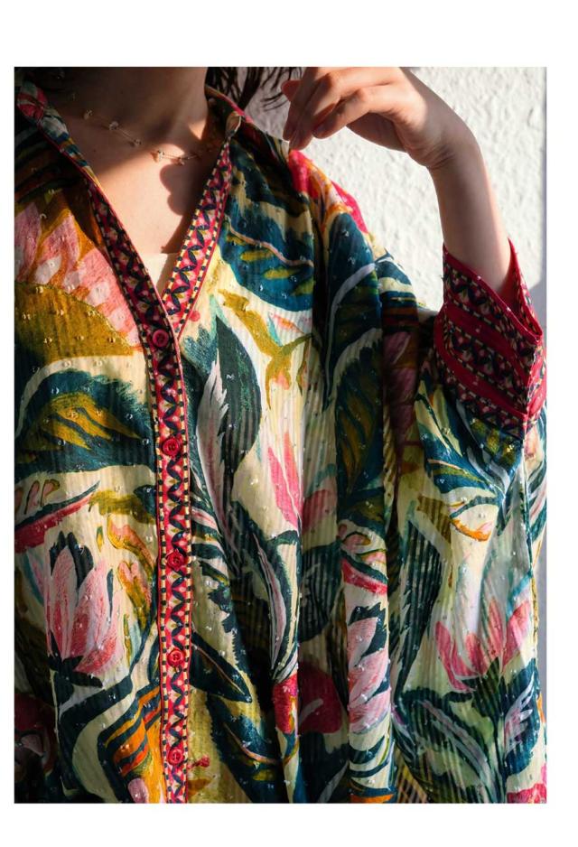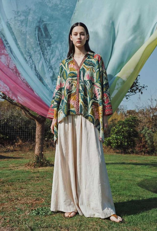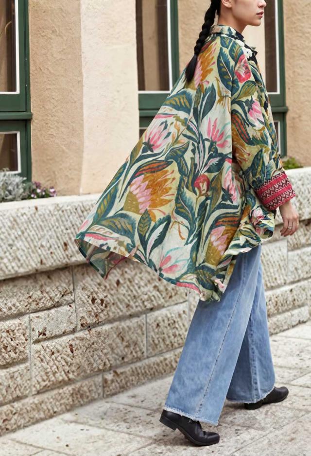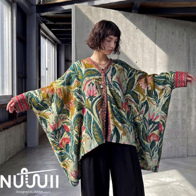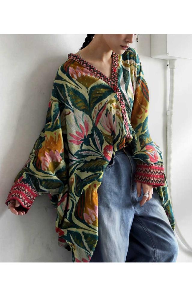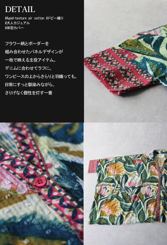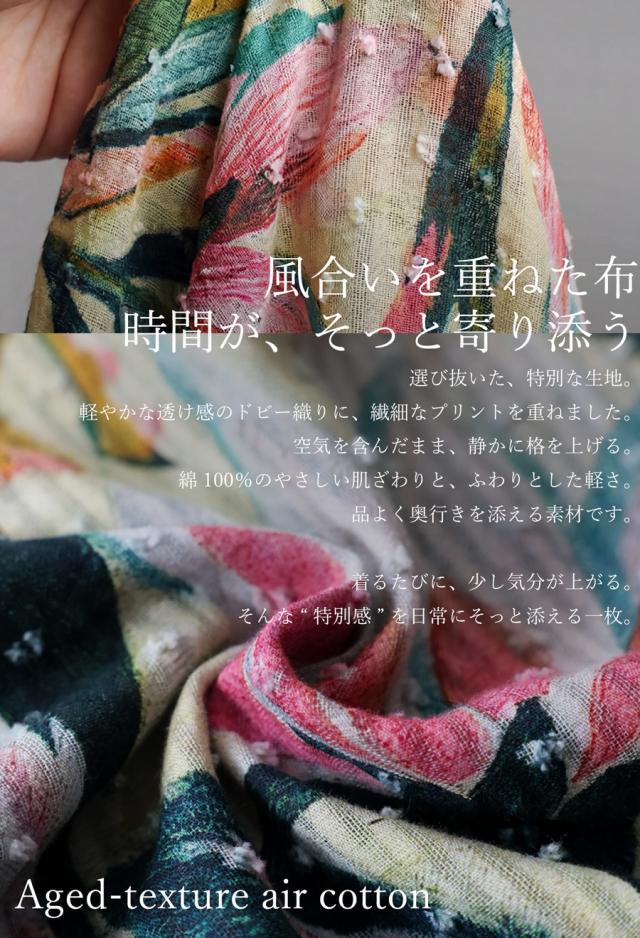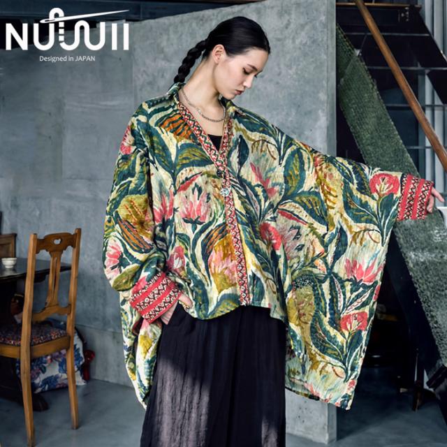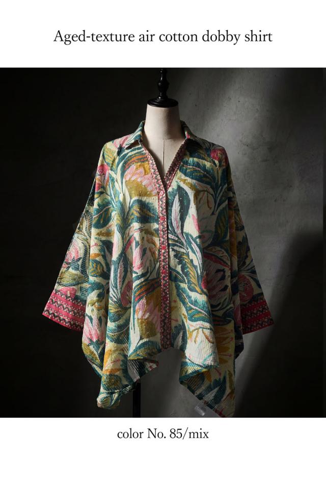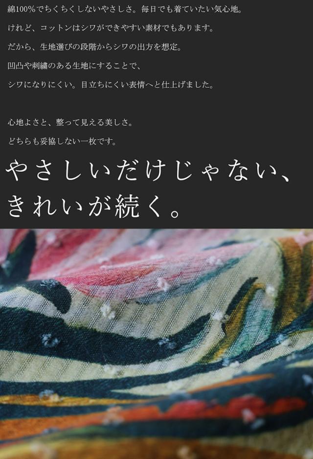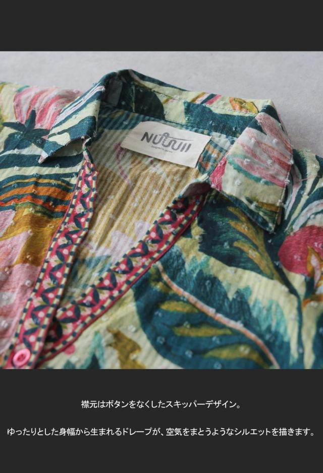 nui-00004 トップス シャツ シアー 綿100 ドビー 花柄 総柄 ワイドシルエット ゆったり 体型カバー スキッパー 前開き 切替 ボタン レイヤード ナチュラル モード カジュアル