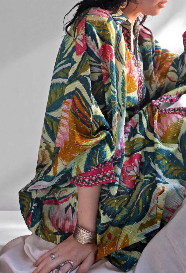空気を含んだような軽やかなシアードビー生地に繊細な花柄(総柄)を施したブラウス(シャツ)です。