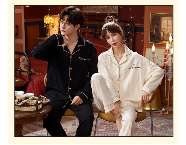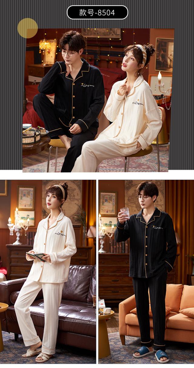 ペアルックパジャマ、カップルパジャマ、純綿ルームウェア、メンズパジャマ、レディースパジャマ、長袖セット、秋冬用パジャマ、通気性、快適、カジュアル睡衣、夫婦パジャマ