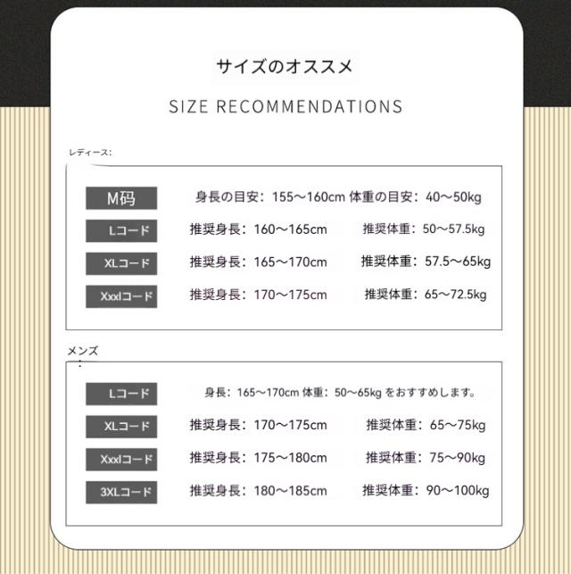 メンズ:L〜3XL(身長165〜185cm/体重50〜100kg)