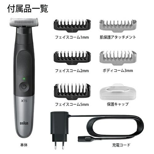 セット内容:ボディ&フェイスグルーマー XT5、フェイ用スコーム(1, 2, 5 mm)、ボディ用コーム (0, 3mm)、保護キャップ、スマートプラグ