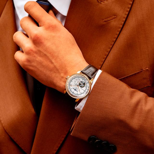 ゴールドカラーのケースは、当時の飛行船で旅を楽しんだ人々の気品ある装いからインスピレーションを得たもの。スリーピーススーツやドレスに身を包み、空のパノラマを眺めていた乗客たちの情景を重ね合わせることで、クラシックな美意識を現代的に再構築しています。落ち着いた色合いのレザーストラップがその雰囲気をさらに引き立て、腕元に上質な存在感をもたらします。