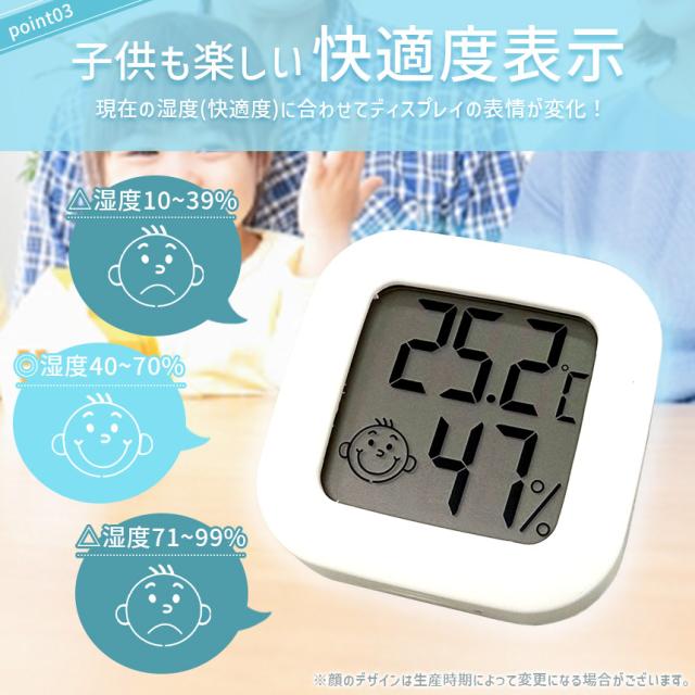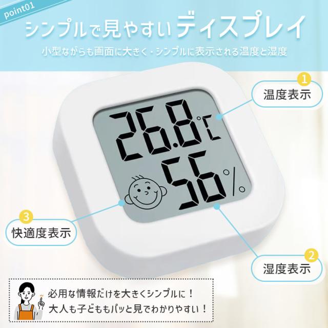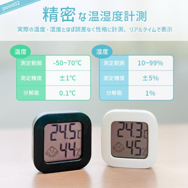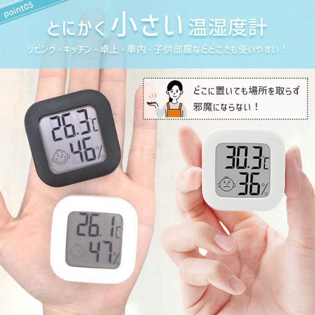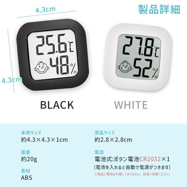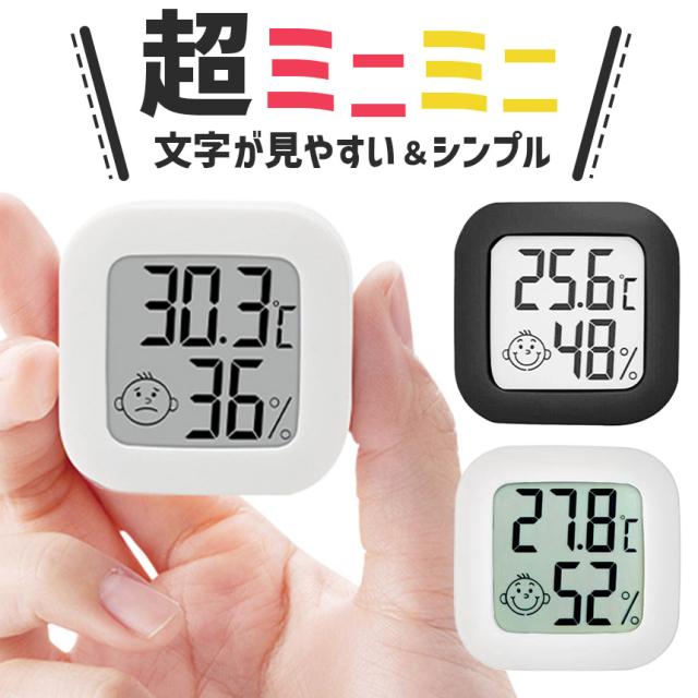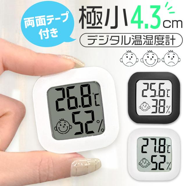 温湿度計 小型 高精度 デジタル ミニ コンパクト 温度計 湿度計 室温計 置き型 スタンド 壁掛け 両面テープ付き 電池式 小さい シンプル かわいい おしゃれ 顔マーク 薄型 赤ちゃん 子供 子ども 熱中症対策 乾燥対策 ブラック ホワイト 黒 白 卓上