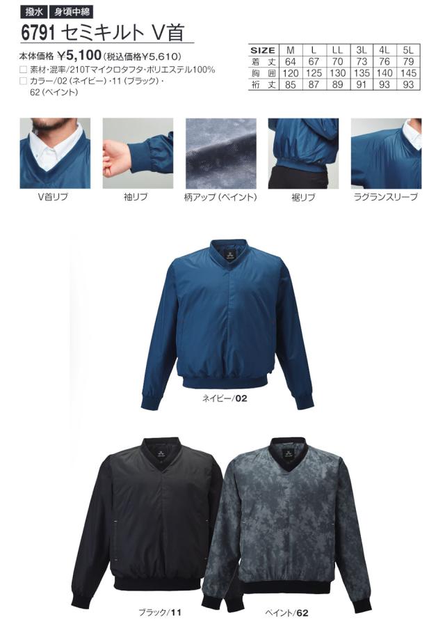 6791 セミキルト V首(撥水・身頃中綿)