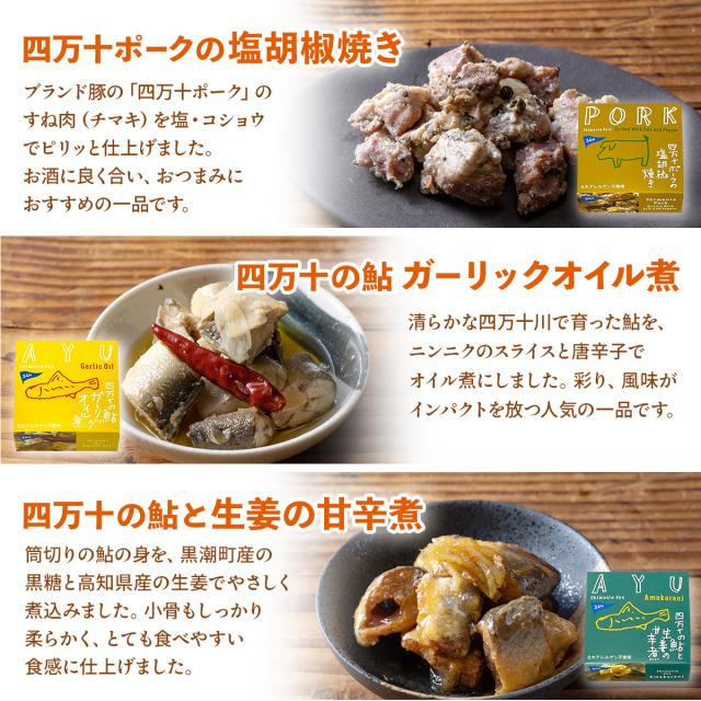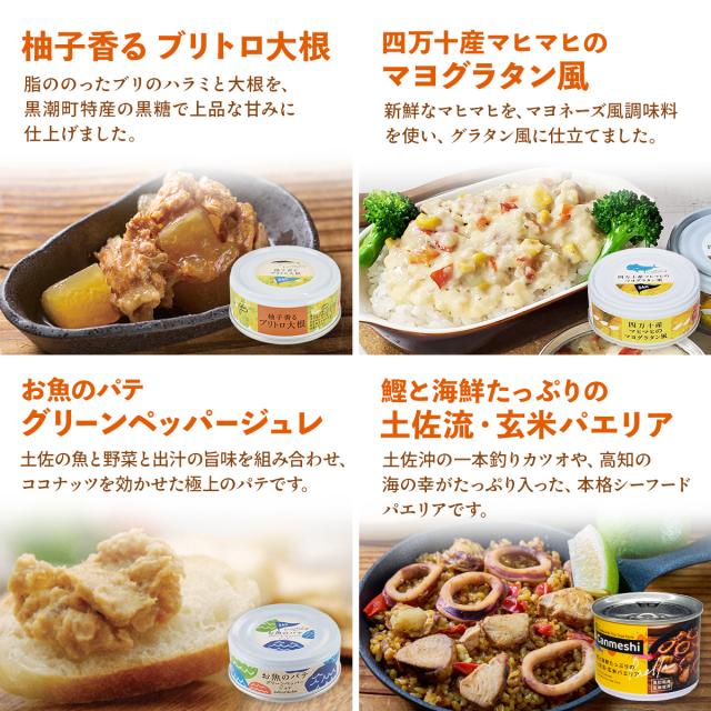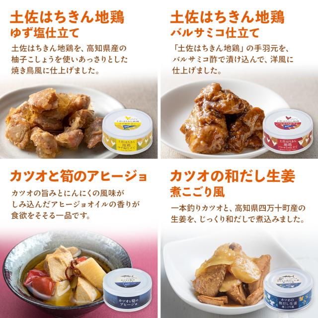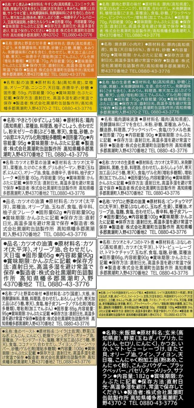 土佐あかうしのスジ煮込み鍋 95g 四万十ポークのネギ塩タレ 90g 四万十ポークとゴボウの甘辛煮 90g 四万十ポークの塩胡椒焼き 80g 四万十の鮎 ガーリックオイル煮 90g 四万十の鮎と生姜の甘辛煮 90g 土佐はちきん地鶏ゆず塩仕立て 95g 土佐はちきん地鶏バルサミコ仕立て 90g カツオと筍のアヒージョ 95g カツオの和だし生姜 煮こごり風 95g 黒潮オイルのごろっとカツオ 90g 黒潮オイルのマグロとキノコ 100g カツオdeオリーブ 90g トマトで煮込んだ カツオとキノコ 90g 柚子香る ブリトロ大根 95g 四万十産マヒマヒのマヨグラタン風 100g お魚のパテ グリーンペッパージュレ 100g 鰹と海鮮たっぷりの土佐流・玄米パエリア 182g 18種 18缶 |