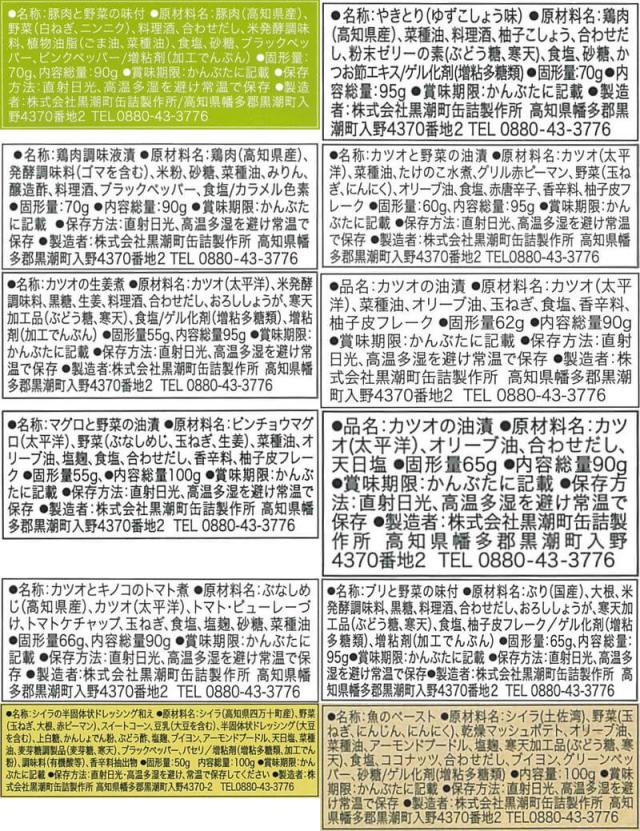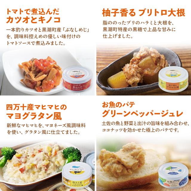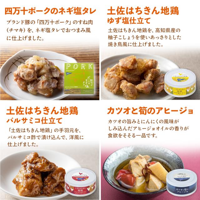 四万十ポークのネギ塩タレ 90g 土佐はちきん地鶏ゆず塩仕立て 95g 土佐はちきん地鶏バルサミコ仕立て 90g カツオと筍のアヒージョ 95g カツオの和だし生姜 煮こごり風 95g 黒潮オイルのごろっとカツオ 90g 黒潮オイルのマグロとキノコ 100g カツオdeオリーブ 90g トマトで煮込んだ カツオとキノコ 90g 柚子香る ブリトロ大根 95g 四万十産マヒマヒのマヨグラタン風 100g お魚のパテ グリーンペッパージュレ 100g 12種 12缶 |