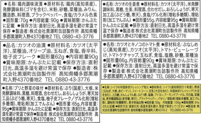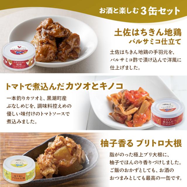 ■ お酒と楽しむ3缶セット 土佐はちきん地鶏バルサミコ仕立て 90g トマトで煮込んだ カツオとキノコ 90g 柚子香る ブリトロ大根 95g ■ 魚介のうまみ3缶セット 黒潮オイルのごろっとカツオ 90g 柚子香る ブリトロ大根 95g 四万十産マヒマヒのマヨグラタン風 100g ■ カツオ三昧3缶セット カツオの和だし生姜 煮こごり風 95g 黒潮オイルのごろっとカツオ 90g トマトで煮込んだ カツオとキノコ 90g 3種類のセットからお選びいただけます |