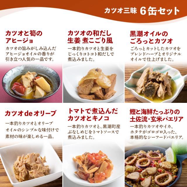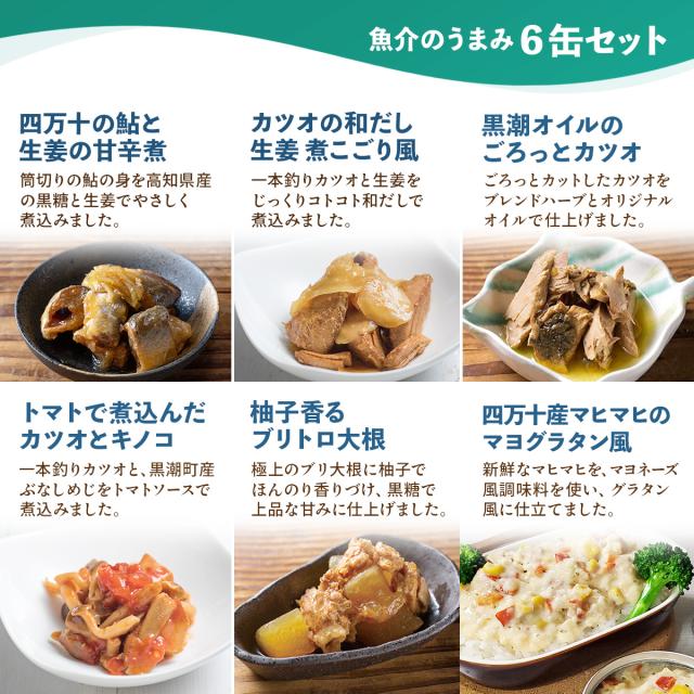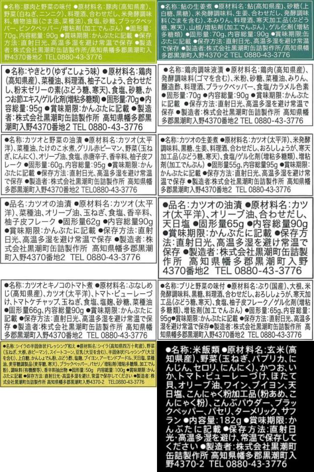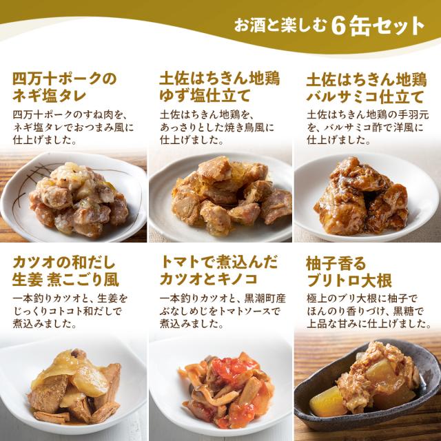 ■ お酒と楽しむ6缶セット 四万十ポークのネギ塩タレ 90g 土佐はちきん地鶏ゆず塩仕立て 95g 土佐はちきん地鶏バルサミコ仕立て 90g カツオの和だし生姜 煮こごり風 95g トマトで煮込んだ カツオとキノコ 90g 柚子香る ブリトロ大根 95g ■ 魚介のうまみ6缶セット 四万十の鮎と生姜の甘辛煮 90g カツオの和だし生姜 煮こごり風 95g 黒潮オイルのごろっとカツオ 90g トマトで煮込んだ カツオとキノコ 90g 柚子香る ブリトロ大根 95g 四万十産マヒマヒのマヨグラタン風 100g ■ カツオ三昧6缶セット カツオと筍のアヒージョ 95g カツオの和だし生姜 煮こごり風 95g 黒潮オイルのごろっとカツオ 90g カツオdeオリーブ 90g トマトで煮込んだ カツオとキノコ 90g 鰹と海鮮たっぷりの土佐流・玄米パエリア 182g 3種類のセットからお選びいただけます |