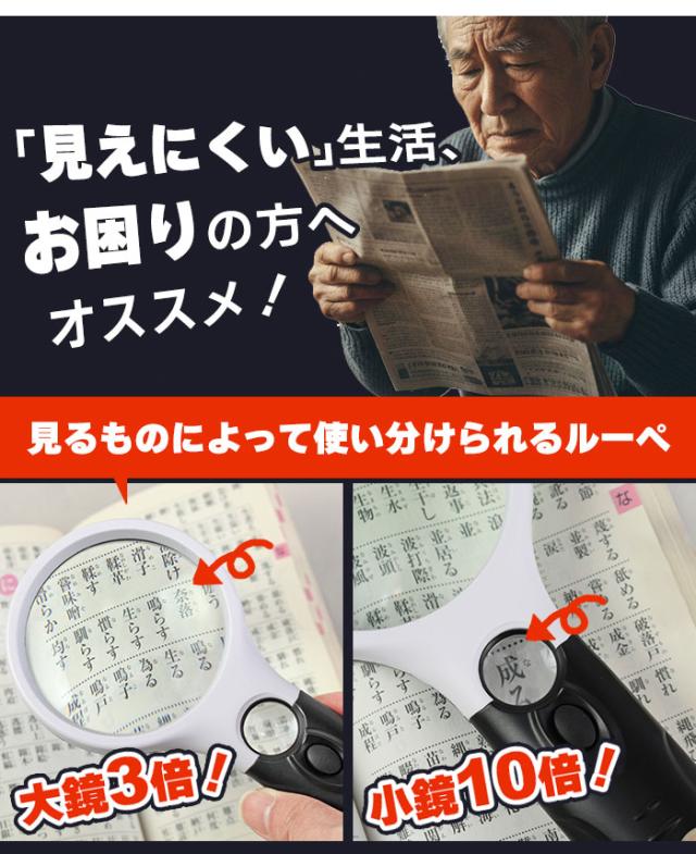 キーワード: ルーペ 拡大鏡 手持ちルーペ LEDルーペ LED付きルーペ ライト付きルーペ 3倍 10倍 3倍10倍 高倍率 虫眼鏡 虫めがね 拡大レンズ アクリルレンズ 軽量 割れにくい コンパクト 電池式 単4電池 新聞 読書用 新聞用 説明書 取扱説明書 見やすい 細かい文字 精密作業 模型 手芸 基板 チェック 趣味 作業用 シニア 老眼対策 老眼サポート 観察 学習 仕事 便利グッズ
