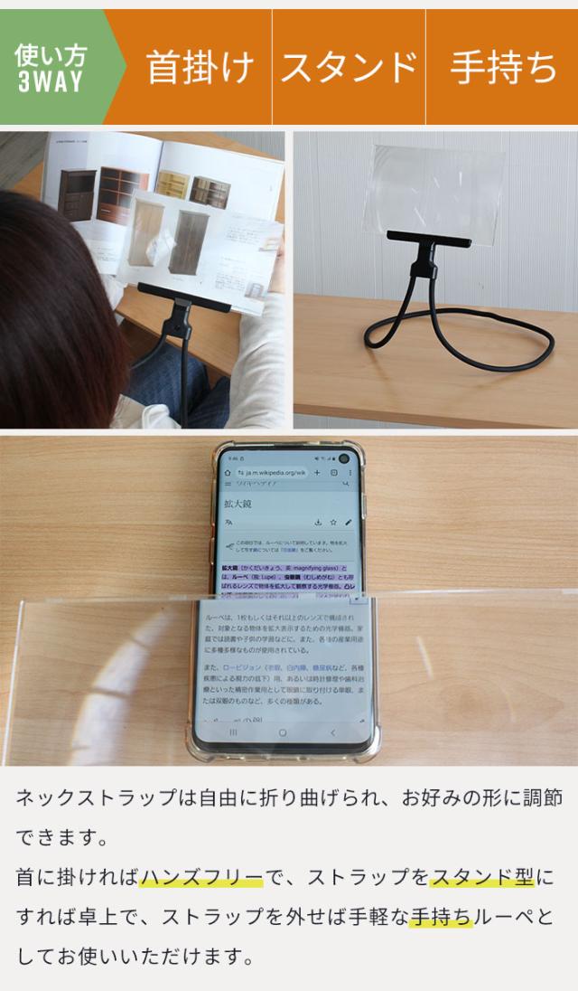 首に掛ければハンズフリーで、ストラップをスタンド型にすれば卓上で、ストラップを取り外せば軽量な手持ちルーペとして、お使いいただけます。
