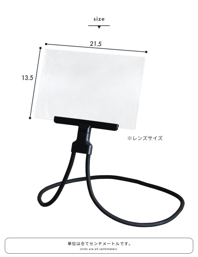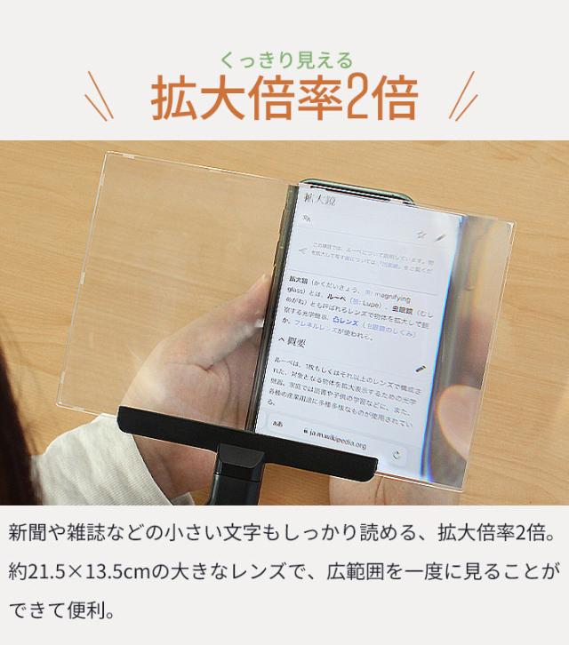 21.5×13.5cmの大型レンズで新聞の細かい文字や薬の説明書もラクラク読めます。
