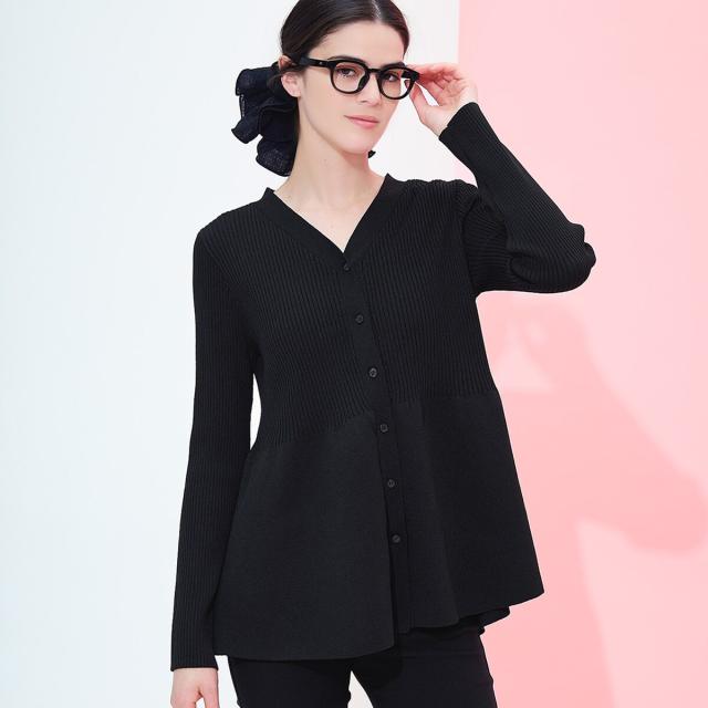 体型カバーと女性らしさを両立する、ウォッシャブルペプラムニットチュニックカーディガン