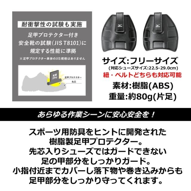 スポーツ用防具をヒントに作られた足甲プロテクター。 落下物や台車の巻き込みから足甲部分をしっかりガードしてくれます。 先芯入りシューズではガードできない足甲部分をカバー。 プロテクター部分の表面積を大きくして小指部分までしっかりサポートしてくれます。 大きな表面積、樹脂製にすることで足甲にかかる重さを分散。 面ファスナー取り付け式なので紐タイプ・ベルトタイプのシューズにも取り付け可能。 ワークシーンの足元をサポートするプロテクターです。 【特徴】 ● 安全靴だけでは防げない甲部分をサポート ● 軽量設計 ● 22.5-29.0cmまで対応可能 ● 紐/ベルトタイプ両方とも対応可能 ● プロテクター部分の表面積を大きくして小指部分までカバー |