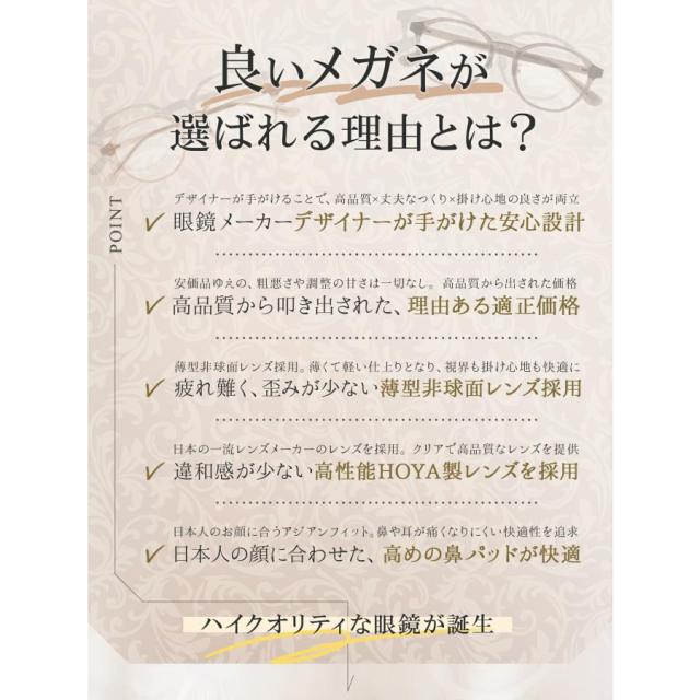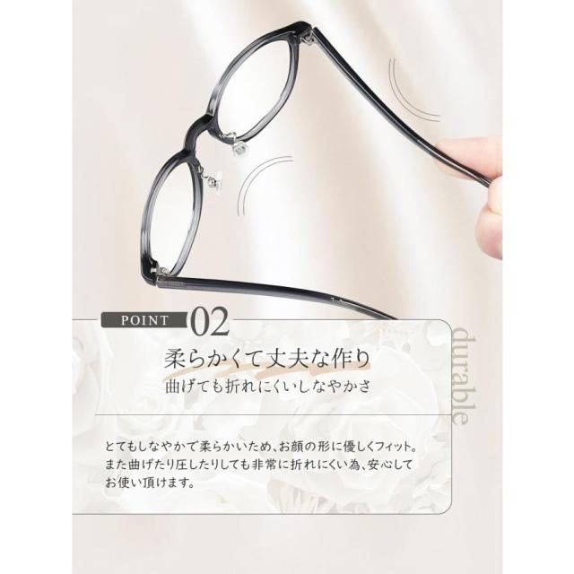 HOYA内面累進レンズ採用でユレやゆがみを抑え、近くも遠くもクリアに見える遠近両用メガネです。顔なじみのよいニュアンスカラーと、女性らしいやわらかな曲線のボストン型・ウェリントン型フレームで知的さと可愛らしさを両立。軽量TR90素材とバネ性のある構造で長時間かけても耳やこめかみが痛くなりにくく、鼻パッドは調整可能でズレにくい快適設計。ブラック、グレー、ベージュ、クリアなど全15色から選べ、普段使いから仕事、旅行まで幅広く活躍します