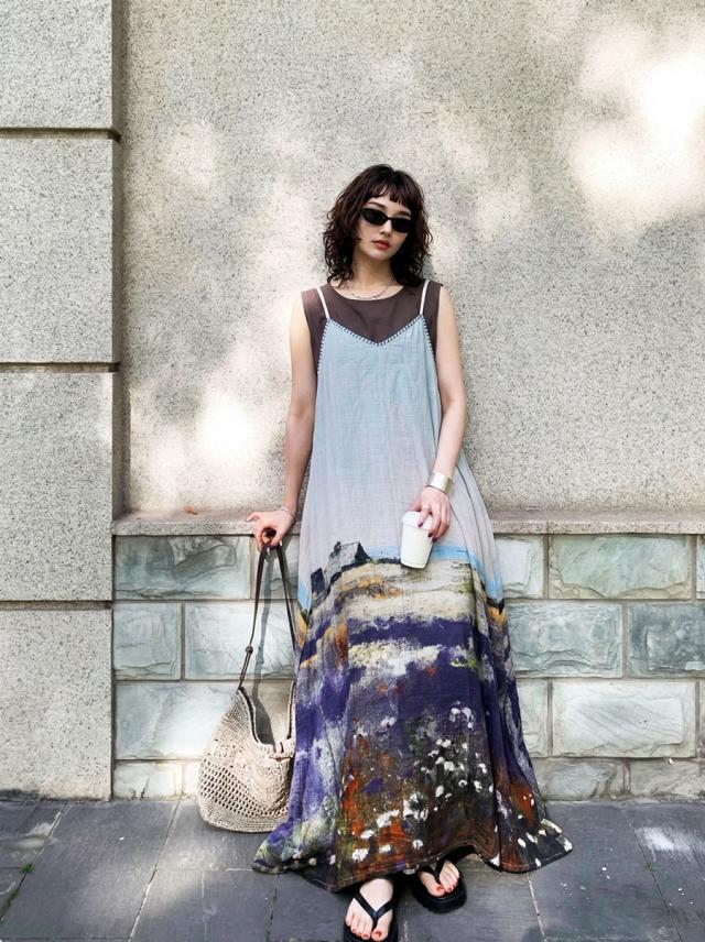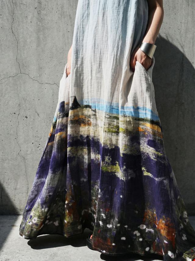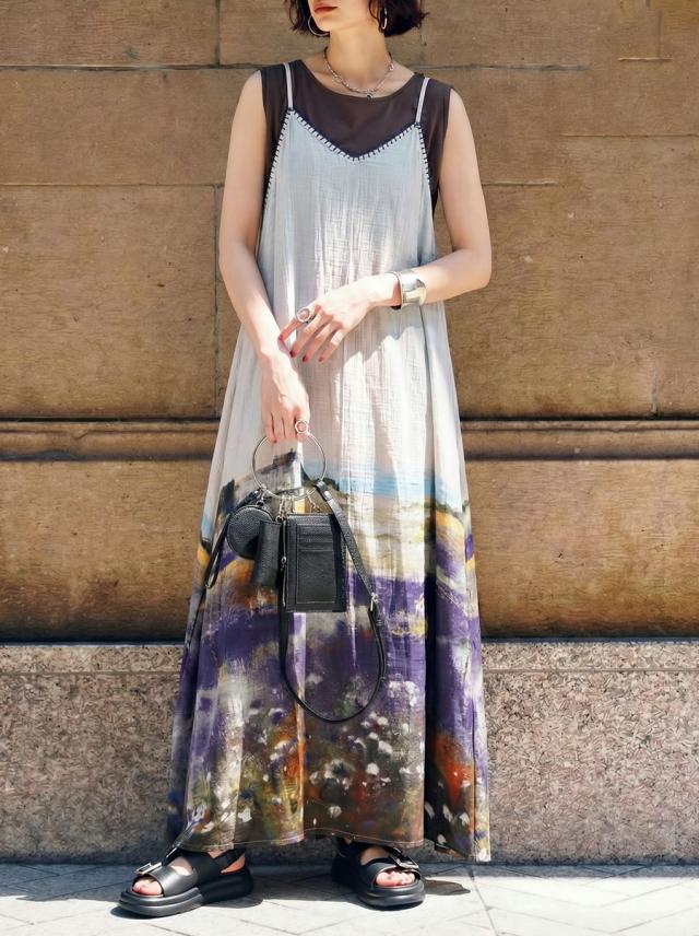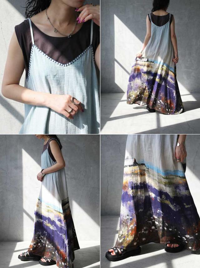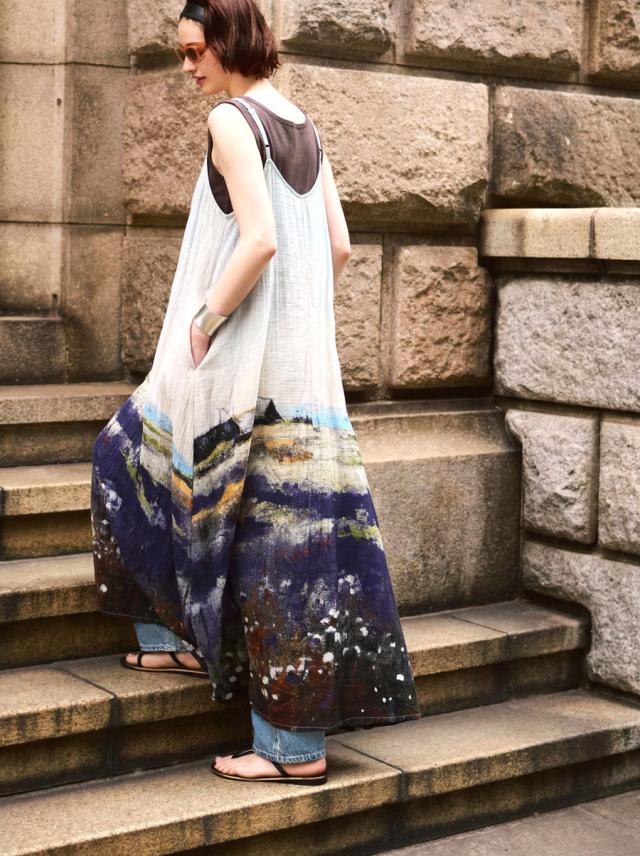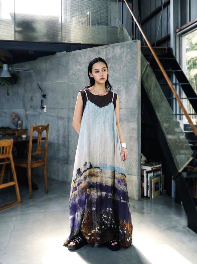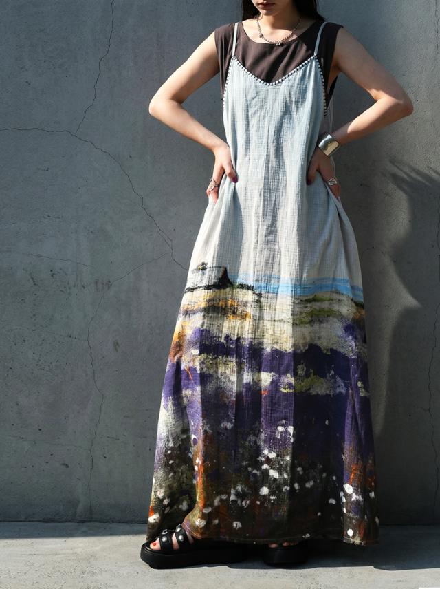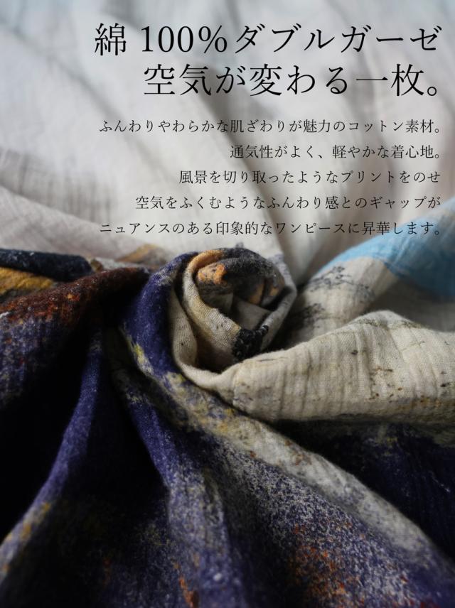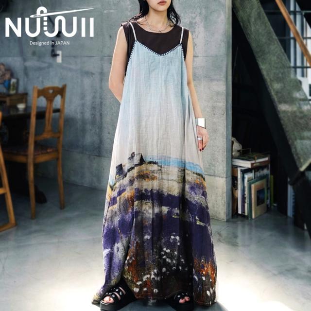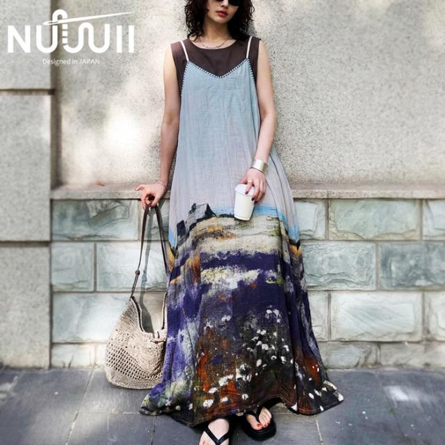 nui-00005 ロングワンピ レディースワンピース 綿 コットン ダブルガーゼ 風景プリント フレア ゆったり 体型カバー ポケット付き 肩紐調節 モード ナチュラル 大人カジュアル 着回し