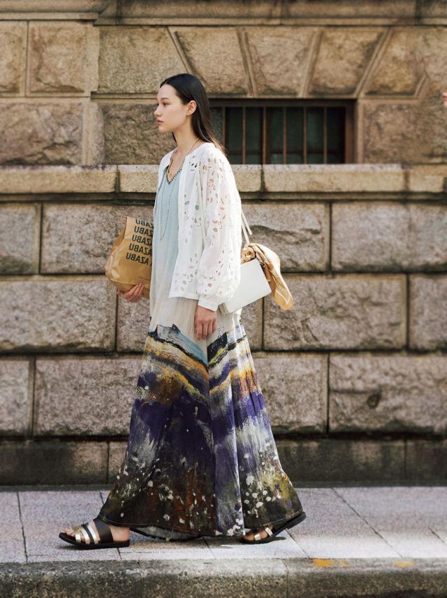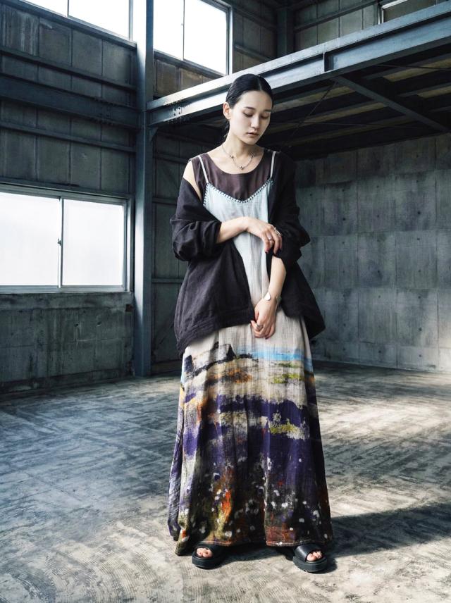 風景プリントをデジタルプリントで表現し、奥行きのあるアートな表情とモードな雰囲気を演出。