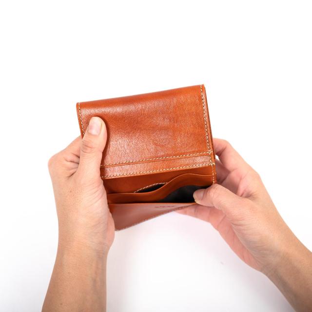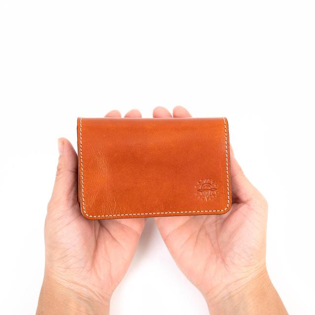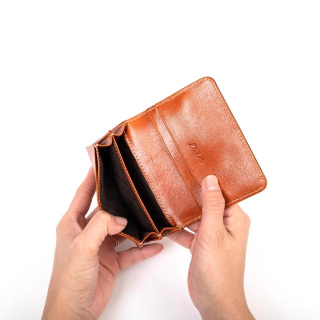 ビジネスシーンで使いやすい、シンプルなデザインの名刺入れ。開くとカードポケットが2つ、フリーポケットが1つ付いています。中は2つに仕切られており、名刺の整理がしやすい仕様に。
