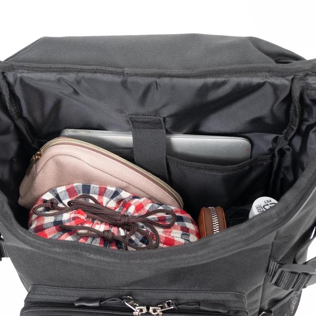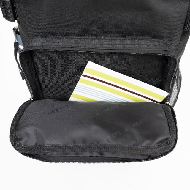 リュックを背負った時にすっきり見えるデザインです。上部分にもファスナーポケットが付いているので、前に背負った時でも小物などが取り出しやすいです。 Dカンやメッシュポケットもあるのでキーホルダーなどを付けたり入れたりすることができます。 ショルダーストラップとチェストベルトを止めることにより背中への密着が感じられ、安定感が感じられます。 撥水生地使用。(防水ではありません。)