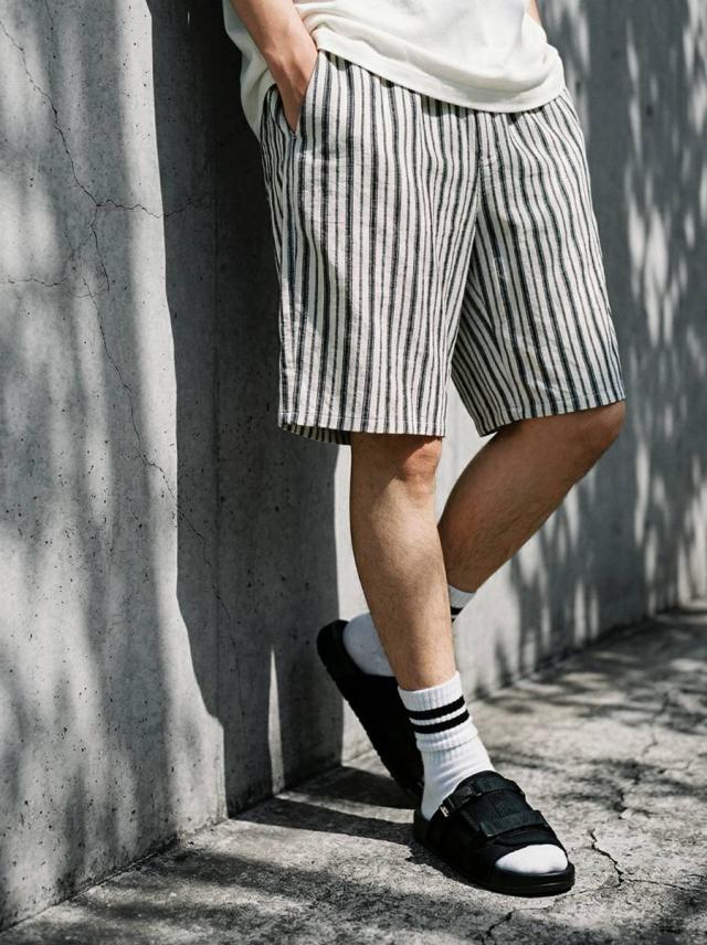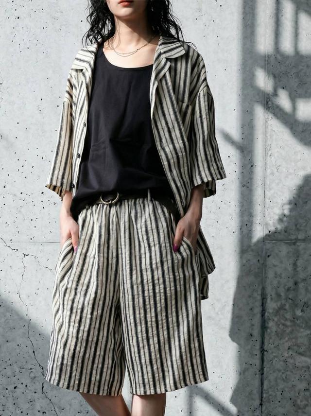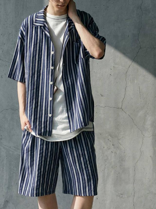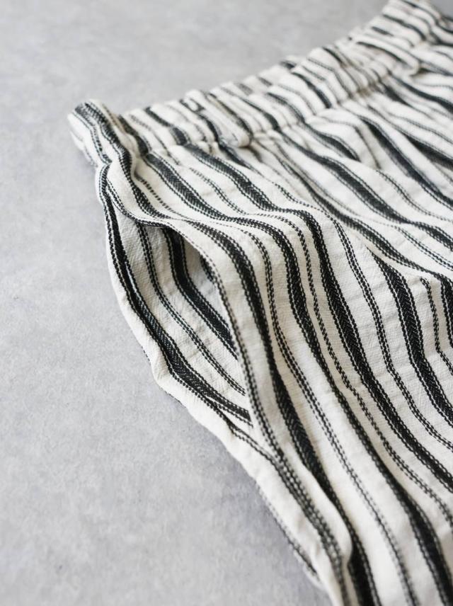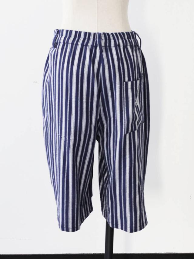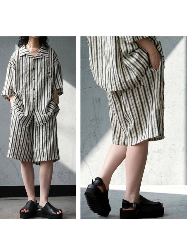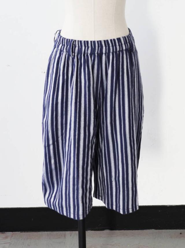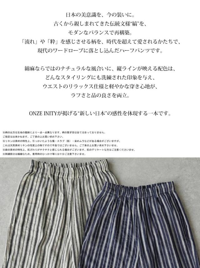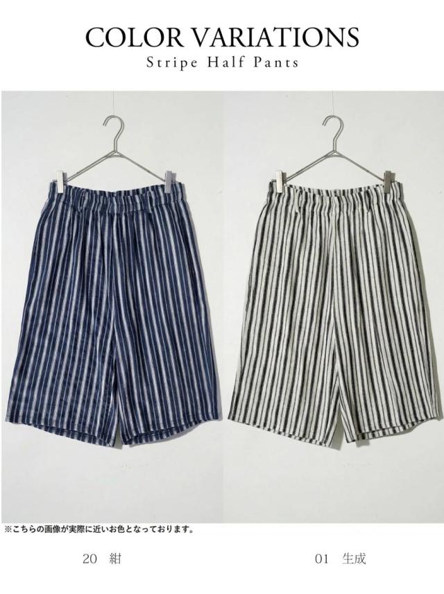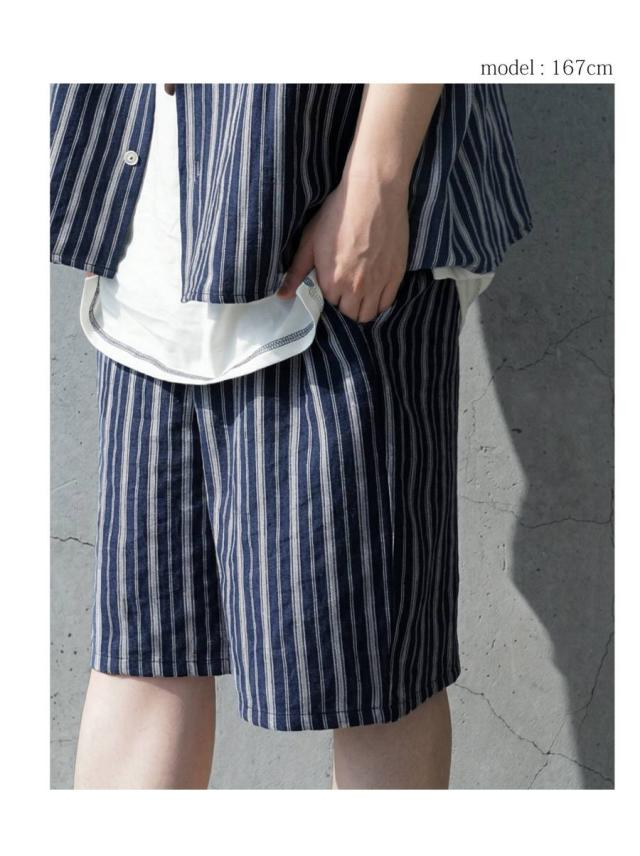 onz-2009 パンツ ショートパンツ ボトムス 綿麻 ウエストゴム ルーズ シルエット ひざ丈 縞柄 イージー ワイド らくちん ナチュラル モード カジュアル セットアップ ユニセックス