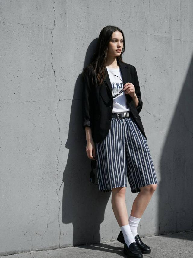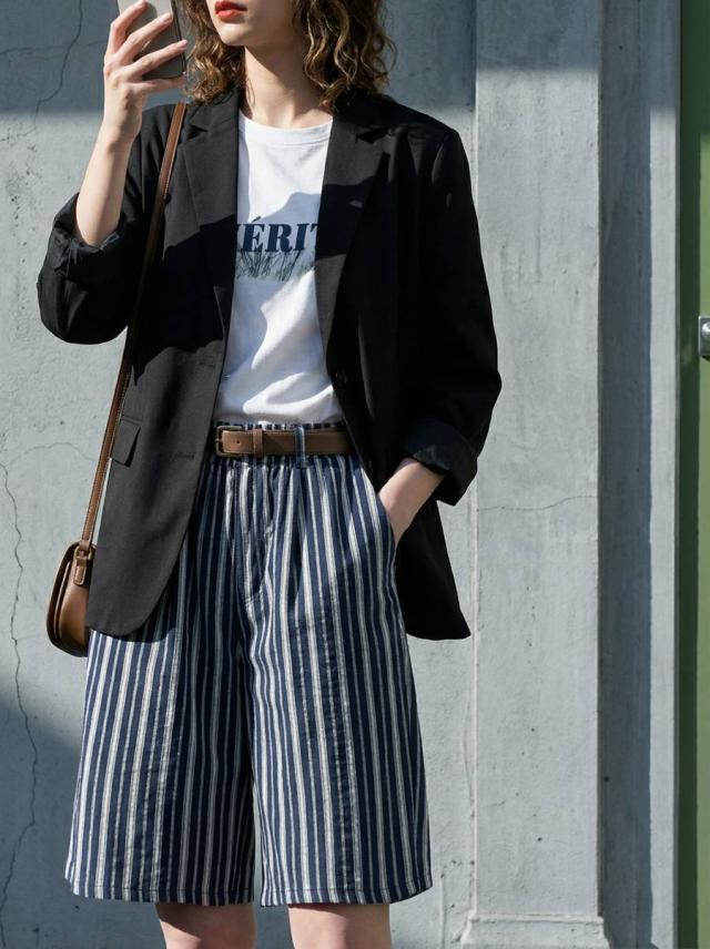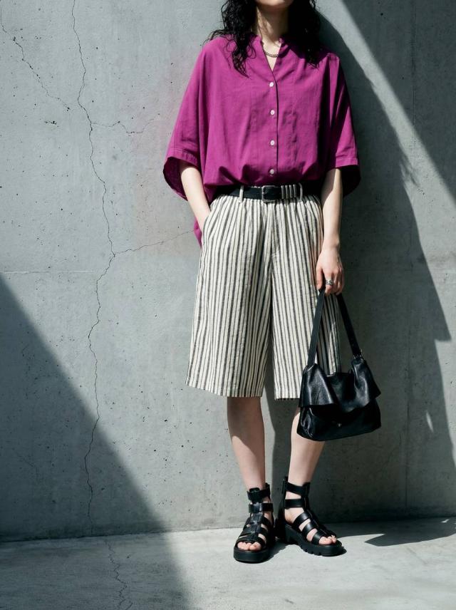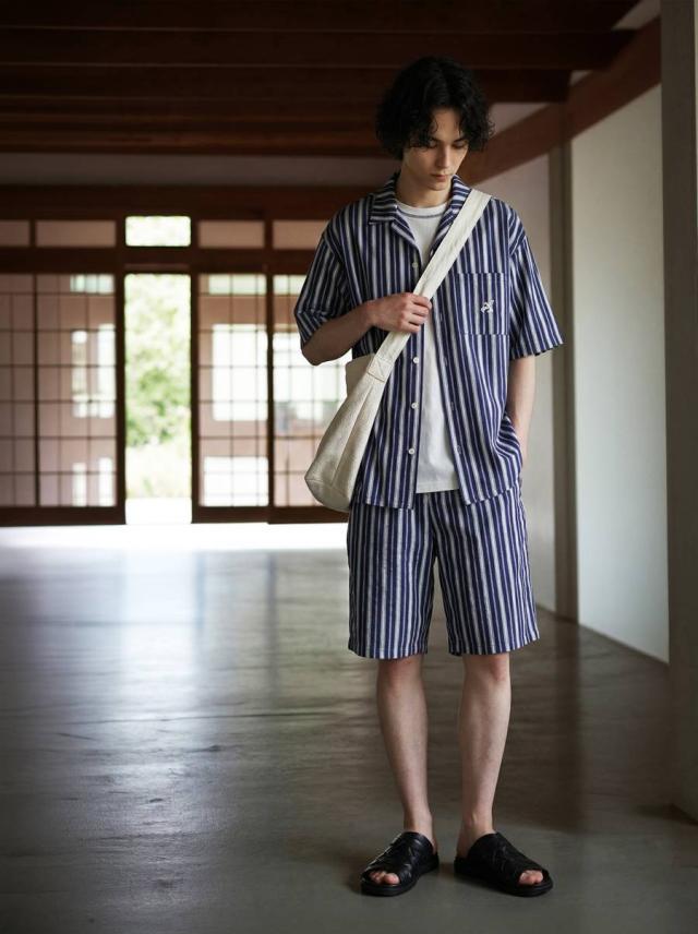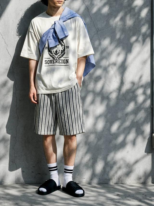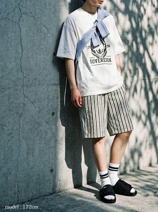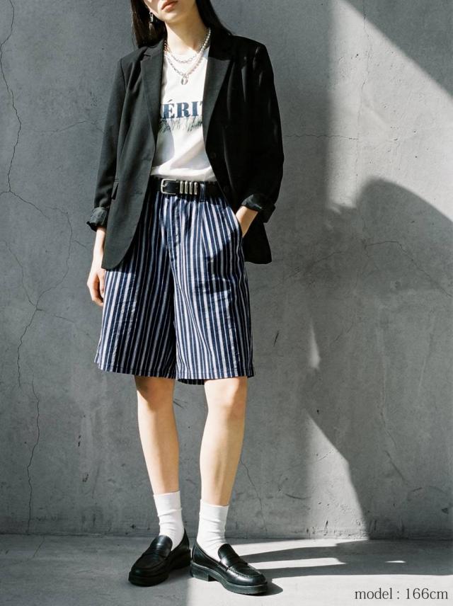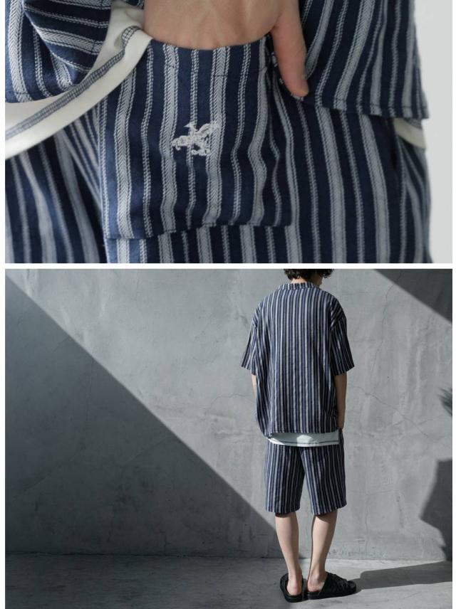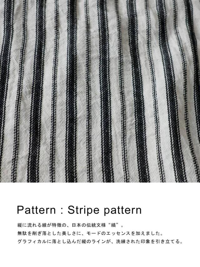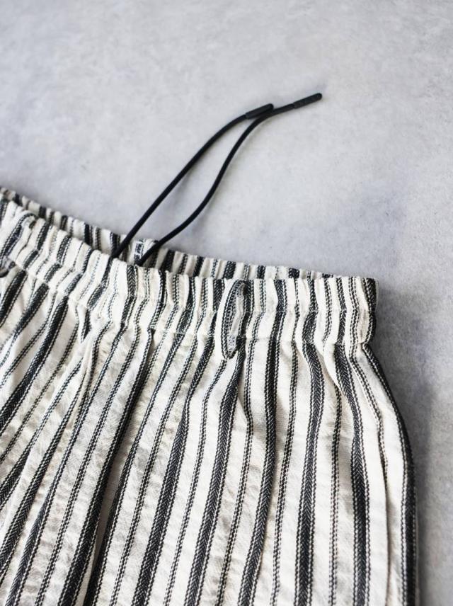 onz-2009 パンツ ショートパンツ ボトムス 綿麻 ウエストゴム ルーズ シルエット ひざ丈 縞柄 イージー ワイド らくちん ナチュラル モード カジュアル セットアップ ユニセックス