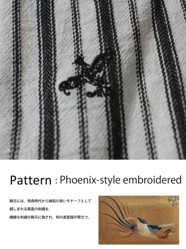 日本の伝統文様である縞柄(ストライプ)をベースに、さりげなく施された鳳凰刺繍がアクセントになっています。