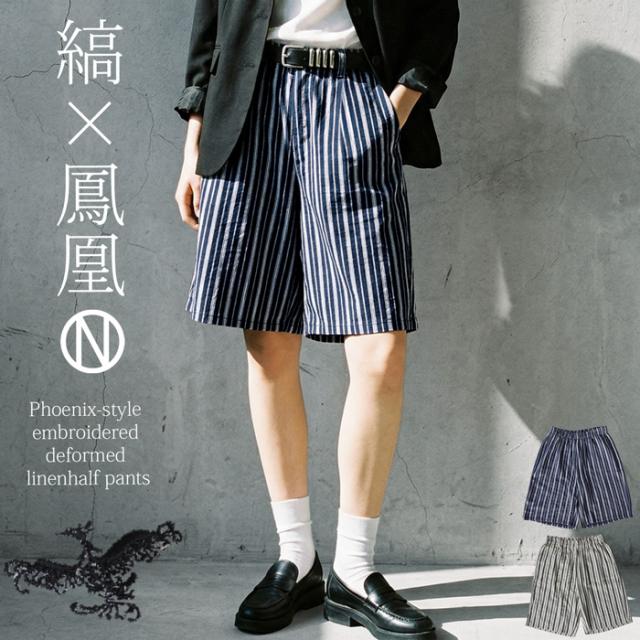 ハーフパンツ レディース ストライプ 鳳凰 刺繍 送料無料・(100)メール便可 春新作