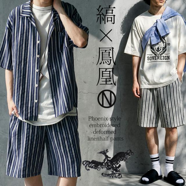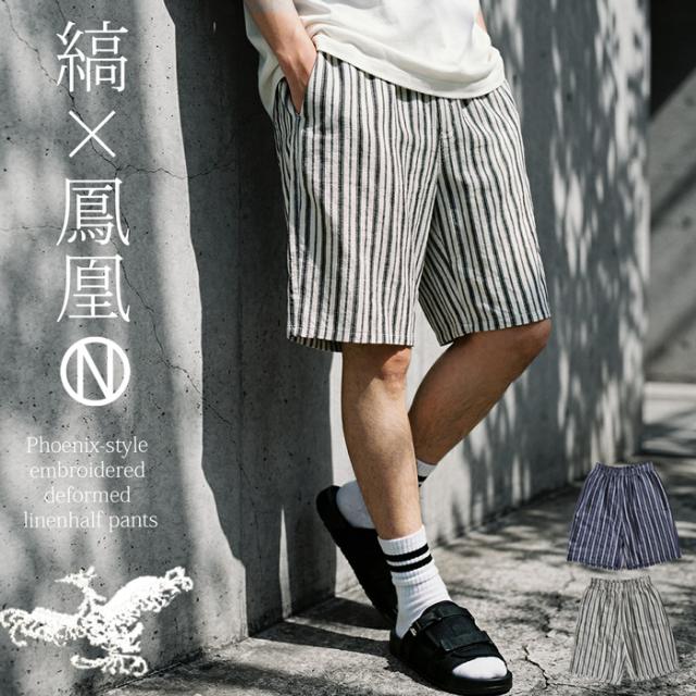ハーフパンツ メンズ ストライプ 鳳凰 刺繍 送料無料・(100)メール便可 春新作