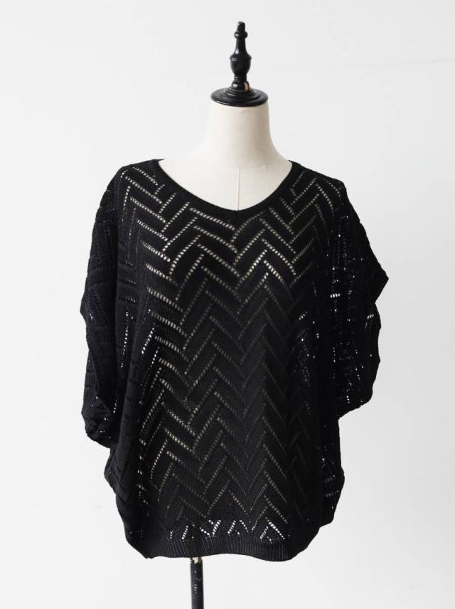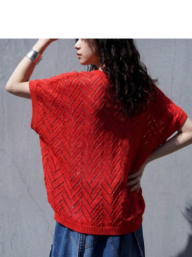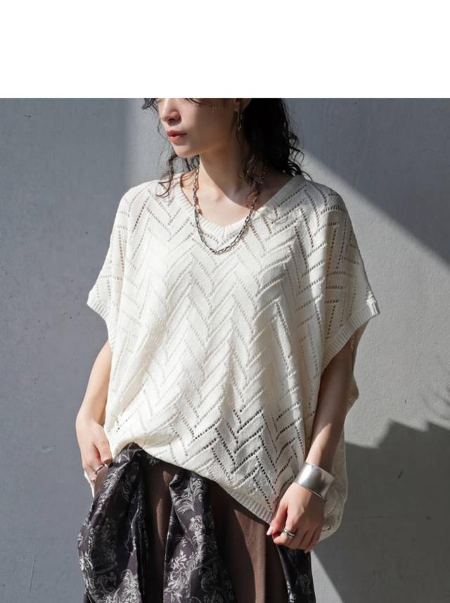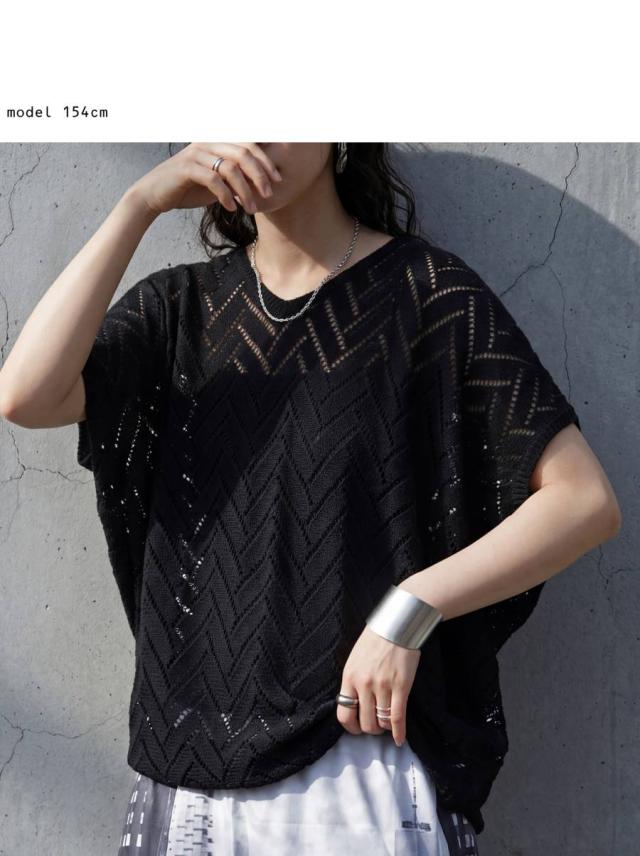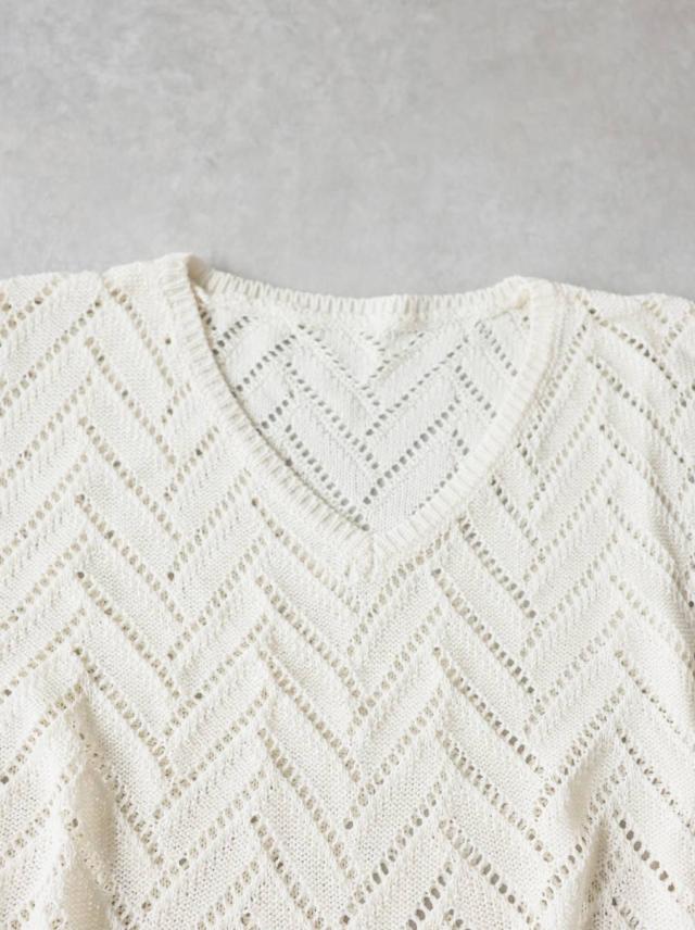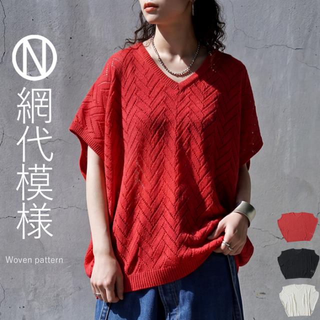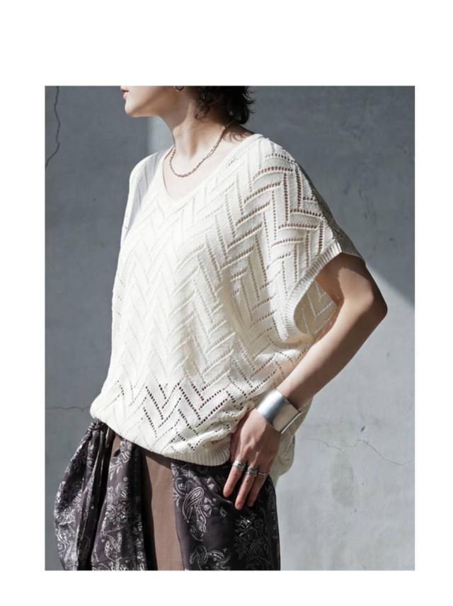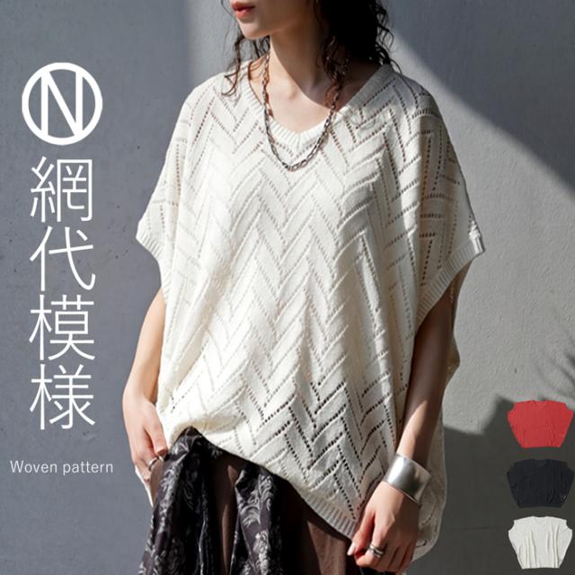 ニット レディース 半袖 Vネック 透かし編み 網代柄 送料無料 ・メール便不可 春新作