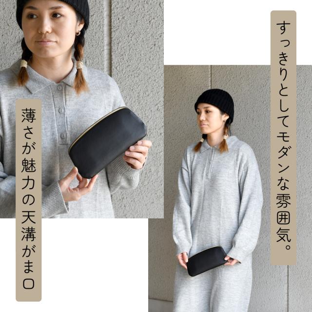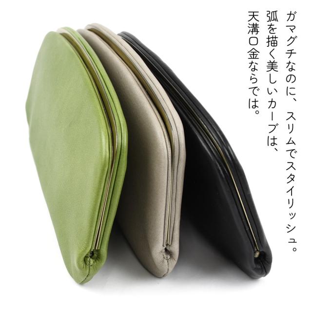 がま口と言えば、ふっくらとレトロなイメージですが、こちらの天溝がま口は、すっきりとしてモダンな雰囲気。天溝口金は、フレームが本体の内側に付くため、留め具も外観からは見えないので、非常にスリムな仕上がり。弧を描くカーブが美しい、スタイリッシュで新しいがま口です。