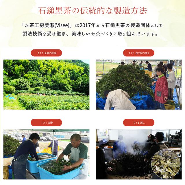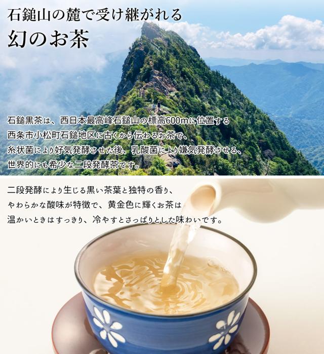 このお茶は、愛媛県の霊峰「石鎚山」のふもとで受け継がれてきた、とても珍しい日本の文化が生んだ後醗酵茶です。昭和に入って次第に生産者が減少しましたが、近年になって健康ブームの影響もあり、生産の継承が行われ地域の特産茶として復活しました。二段発酵により生じる黒い茶葉と独特の香り・やわらかな酸味が特徴で、黄金色に輝くお茶は 温かいときはすっきり、冷やすとさっぱりとした味わいです。