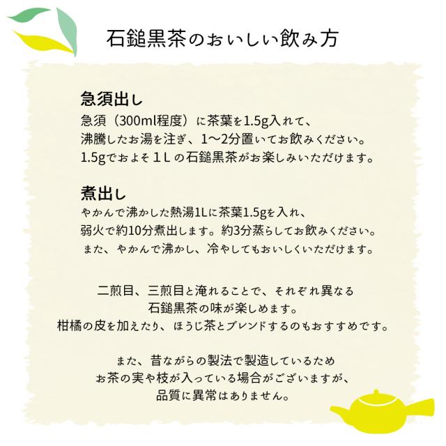 急須でお飲みの場合は、茶葉(約1.5〜2g)、ティーパック1つを急須に入れて熱湯を注ぎ、お好みで1〜2分程度蒸らしてお飲みください。ニ煎目、三煎目と淹れることで、それぞれ異なる石鎚黒茶のお味が楽しめます。柑橘の皮を加えたり、ほうじ茶とブレンドするのもお薦めです。また、冷やしても美味しくいただけます。