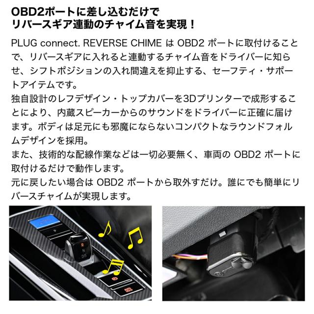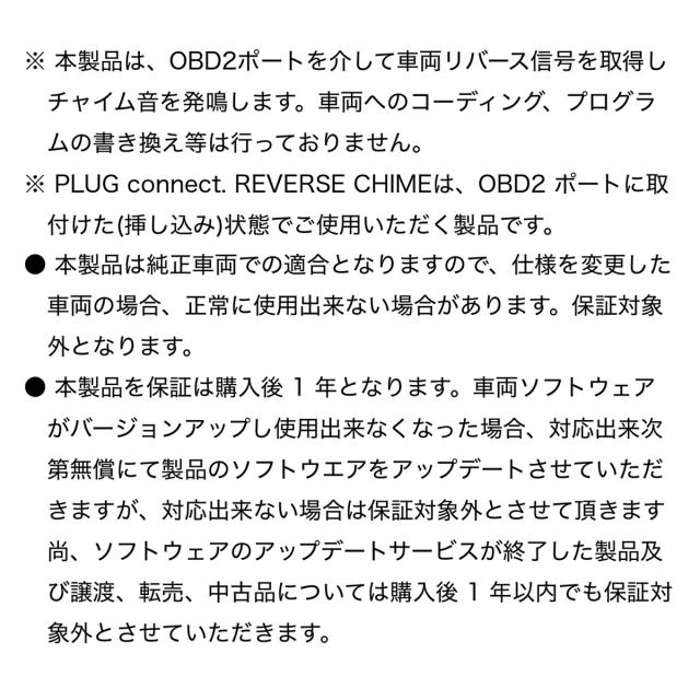 ![]() ![]() ![]() ![]() ------------------------------------- <適合> Audi ・A1 Sportback (GB) ・A3・S3・RS3 Sedan/Sportback (8V) ・A3・S3・RS3 Sedan/Sportback (8Y) ・A4・S4・RS4 (8W) ・A5・S5・RS5 (F5) ・A5・S5 (FU) ・A6・S6・RS6 (4A) ・A7・S7・RS7 (4K) ・A8・S8 (4N) ・Q2・SQ2 (GA) ・Q3・Q3 Sportback(F3) ・RSQ3・RSQ3 Sportback(F3) ・Q5・SQ5 (FY) ・Q5 Sportback・SQ5 Sportback (FY) ・Q5・SQ5(GU) ・Q5 Sportback・SQ5 Sportback (GU) ・Q7 (4M) ・Q8・RSQ8 (F1) ------------------------------------- ※ 本製品は、OBD2ポートを介して車両リバース信号を取得しチャイム音を発鳴します。車両へのコーディング、プログラムの書き換え等は行っておりません。 ※ PLUG connect. REVERSE CHIMEは、OBD2 ポートに取付けた(挿し込み)状態でご使用いただく製品です。 ● 本製品は純正車両での適合となりますので、仕様を変更した車両の場合、正常に使用出来ない場合があります。保証対象外となります。 ● 本製品を保証は購入後 1 年となります。車両ソフトウェアがバージョンアップし使用出来なくなった場合、対応出来次第無償にて製品のソフトウエアをアップデートさせていただきますが、対応出来ない場合は保証対象外とさせて頂きます 尚、ソフトウェアのアップデートサービスが終了した製品及び譲渡、転売、中古品については購入後 1 年以内でも保証対象外とさせていただきます。 ![]() |