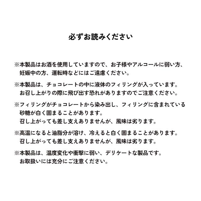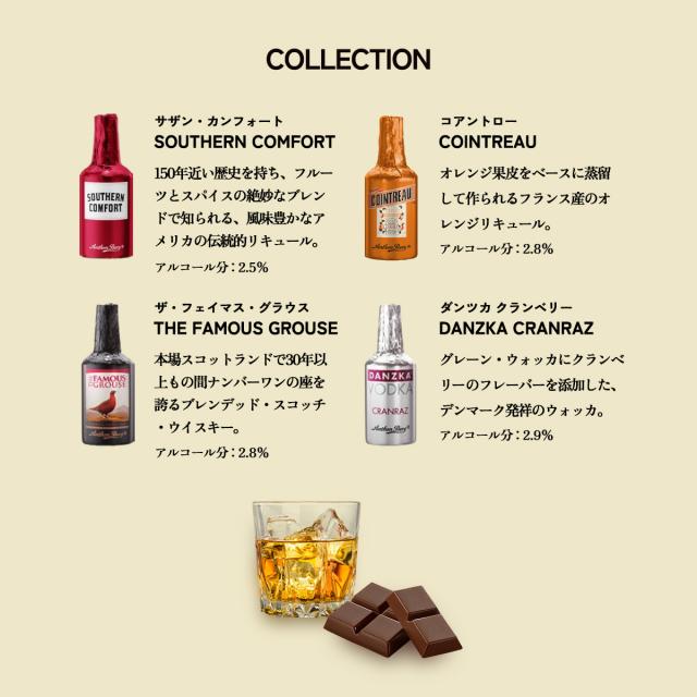 | 原材料名 | <サザン・カンフォート>砂糖、カカオマス、ココアバター、洋酒/酸味料、香料、(一部に乳成分を含む)、<ザ・フェイマス・グラウス>砂糖、カカオマス、ココアバター、洋酒、(一部に乳成分を含む)、<コアントロー>砂糖、カカオマス、ココアバター、洋酒/香料、(一部に乳成分・オレンジを含む)、<ダンツカ クランベリー>砂糖、カカオマス、ココアバター、洋酒/香料、(一部に乳成分を含む) |